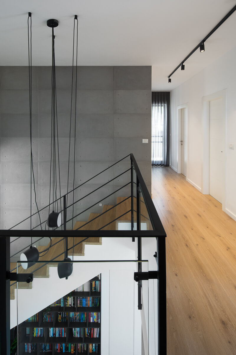 קיר הסלון וקיר המדרגות חופו באריחי בטון גדולים של אקו בטון והרצפה חופתה באריחי 120*120 בגוון בטון עדין, המדרגות חופו בעץ אלון טבעי. נבחרו גופי תאורה טכניים בצבע שחור, אליהם הצטרף גוף תאורה תלוי AIM של חברת FLOS, להדגשת הגובה בחלל המדרגות,