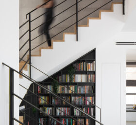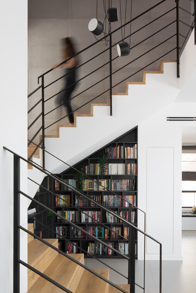 סטודיו עדי אדליס עיצוב פנים, ידוע בחיבתו לספרים וספריות מיוחדות, וגם הפרוייקט הזה זכה לספריה יוצאת דופן, שמוקמה בצורה מושלמת מתחת לגרם המדרגות. הספריה אסימטרית עשויה MDF דקיק בשחור מט. אליה מצטרף מזנון סלון באותו הגוון.