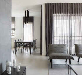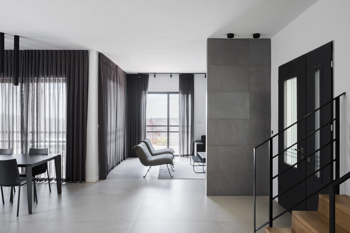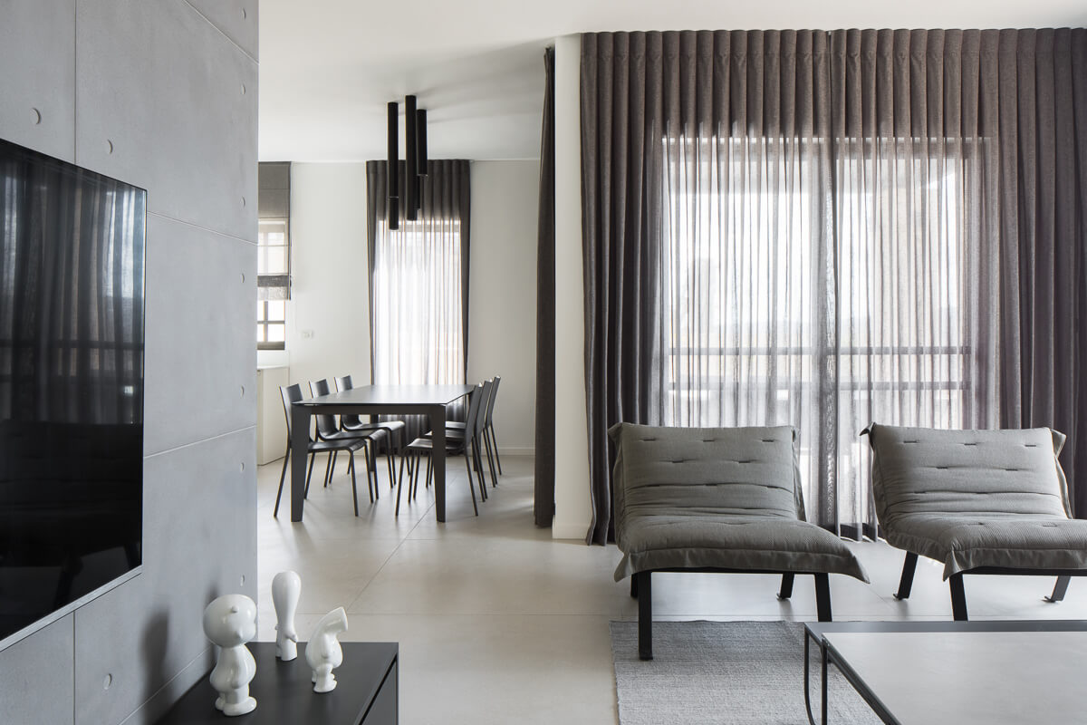 לסיום נבחר ריהוט בקווים נקיים ווילונות כמעט שחורים היוצרים אווירה דרמטית ו"לבושה" מאוד.