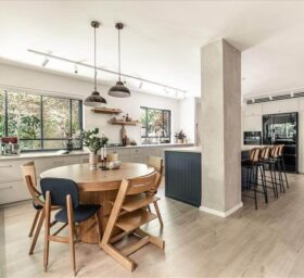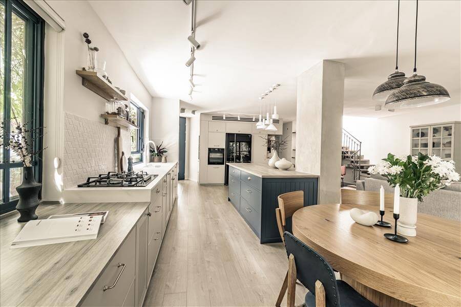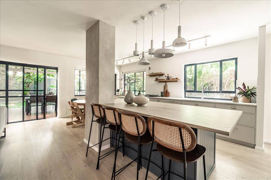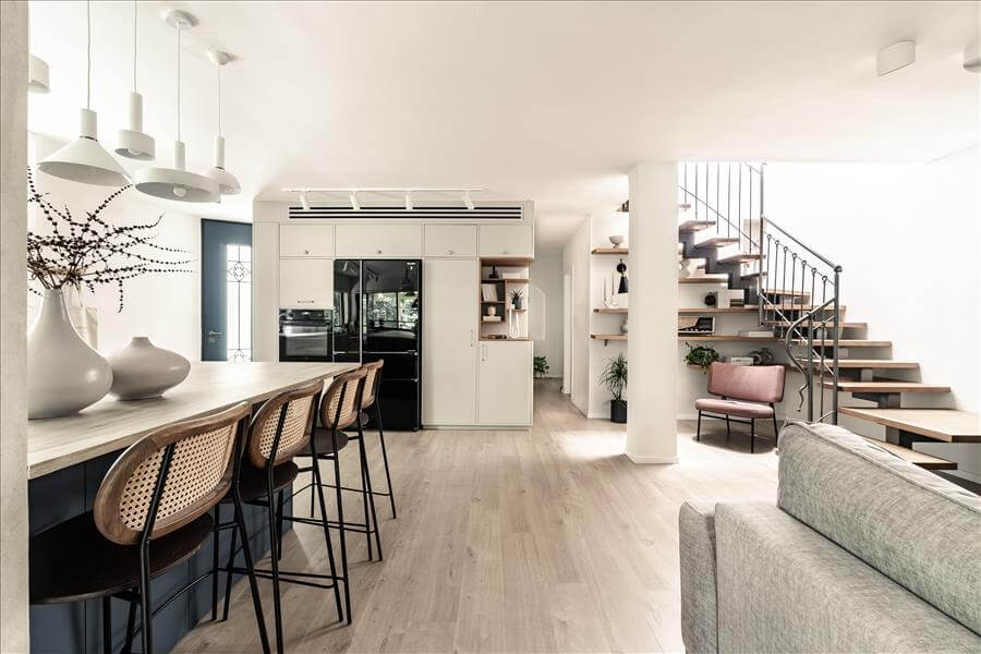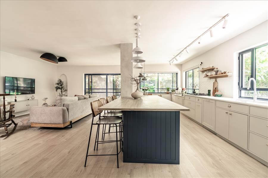 זה התחיל מבית שנראה קטן חשוך וקצת עצוב עם מטבח קטן ויותר מידי קירות ומחיצות ונגמר בחלל מרכזי פתוח מואר ומפנק, לבעלת הבית עסק של אוכל, לכן היה צורך במטבח ענק אבל היא גם התעקשה לשמור על מיקומו המקורי לכן הוחלט לפצל את המטבח להעמיד את הארונות הגבוהים בצד הסלון, ולהוסיף עוד הרבה שטחי איחסון.