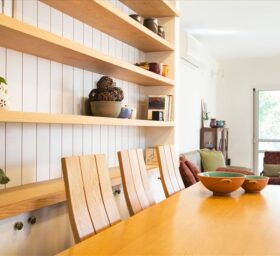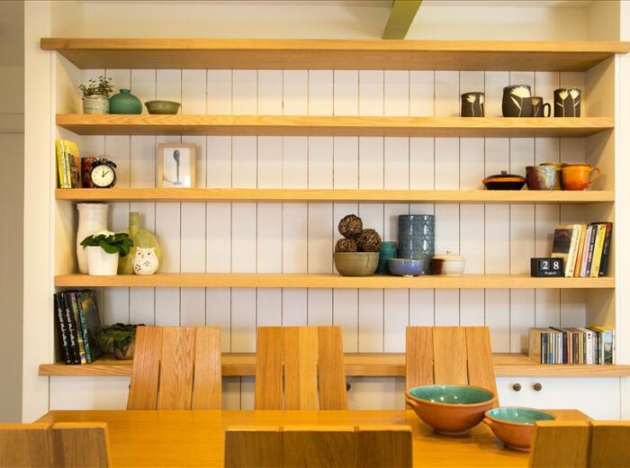 הגדלנו והרחבנו את הבית כדי שיהיה מקום לארח ולפינת האוכל כפי שביקשו ובכל זאת הצניעות ניכרת בפרופורציות החלוקה ובבחירת החומרים – בדיוק כמו בעלי הבית.