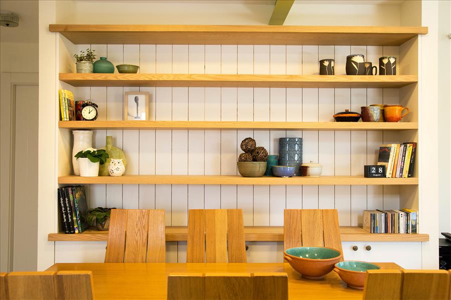פינת האוכל קיבלה מקום של כבוד מול דלת הכניסה שמאחוריה ספריה בהזמנה מנגר.