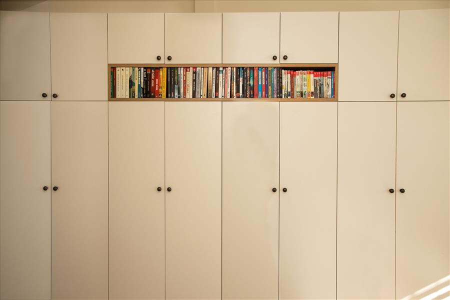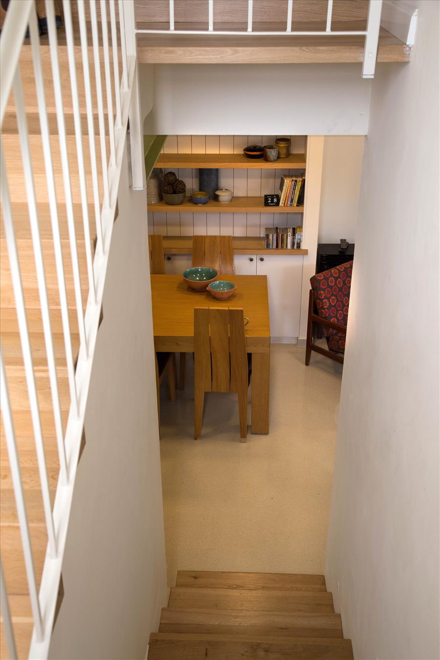 מתחת למדרגות תוכננה דלת שנראית כדלת של ארון ומשמש לאחסון.