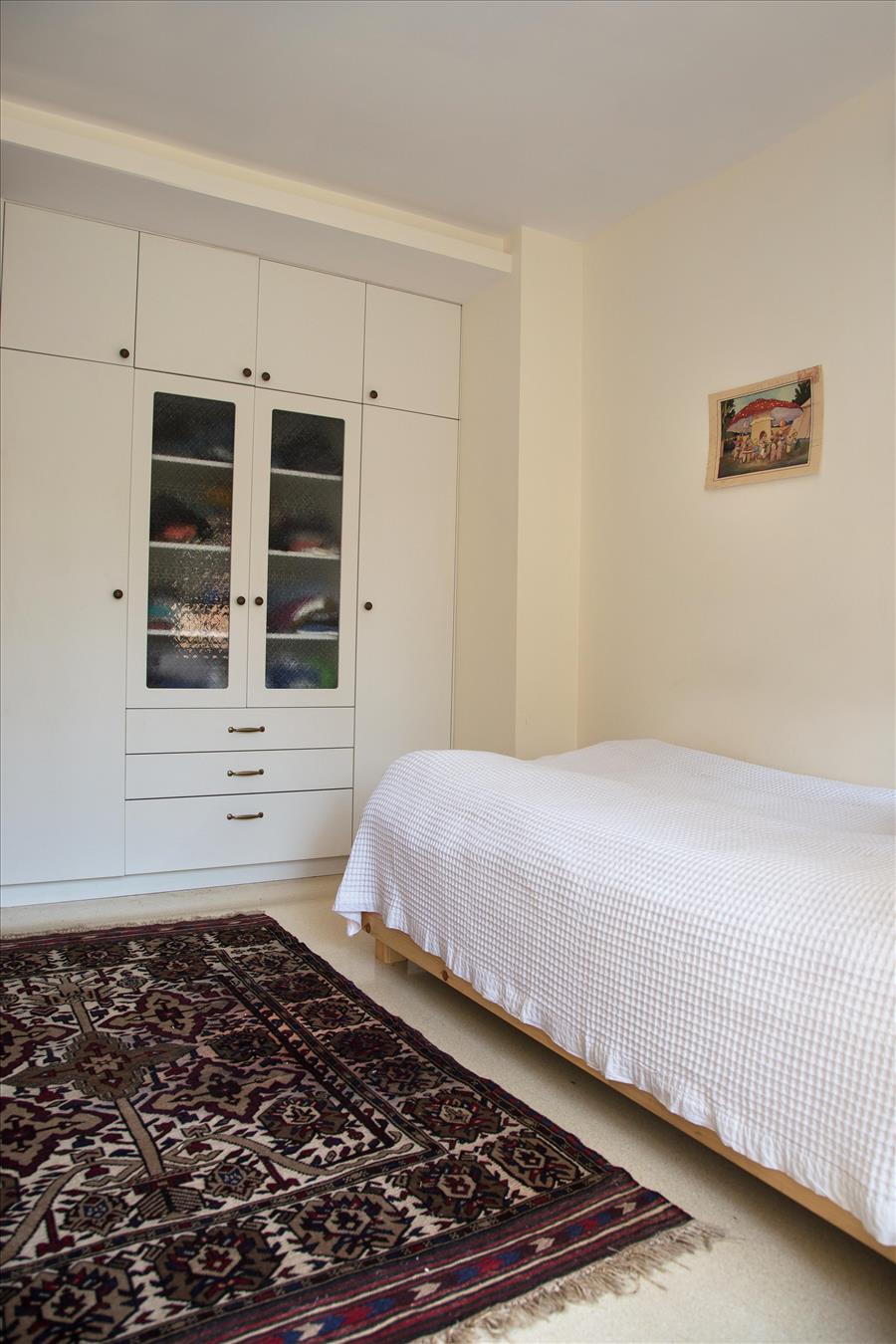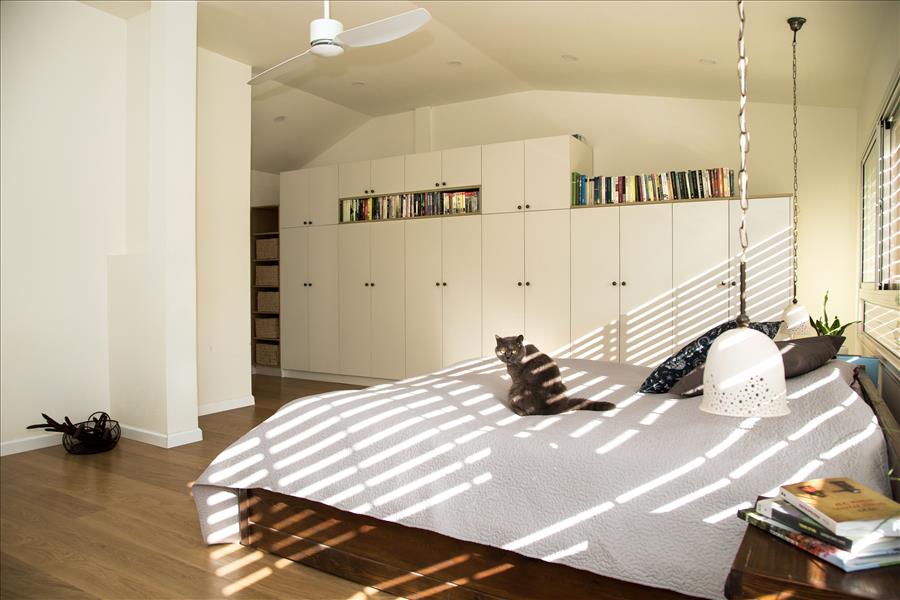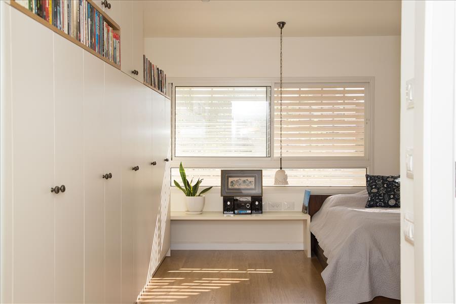 בקומה השניה השארנו כפי שהיה במקור חדר השינה של ההורים אך הורדנו את כל חיפוי העץ על הקירות שהזכיר צימר לא מוצלח, שינינו את סידור הריהוט ,תכננתי ארון גדול מאוד , נישה לשולחן עבודה שיתווסף בעתיד לכשיהיה צורך.