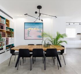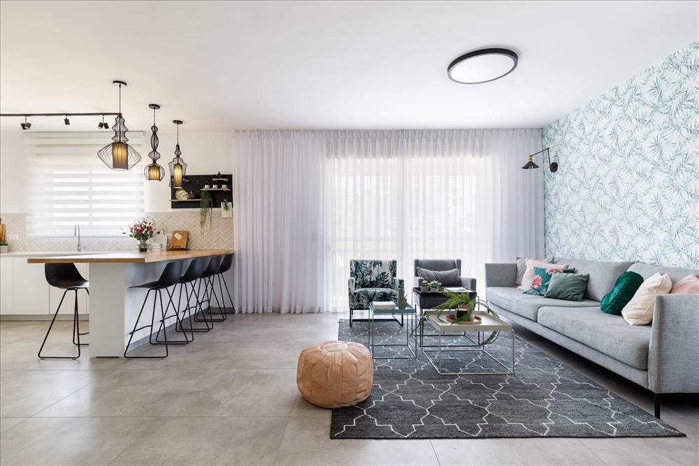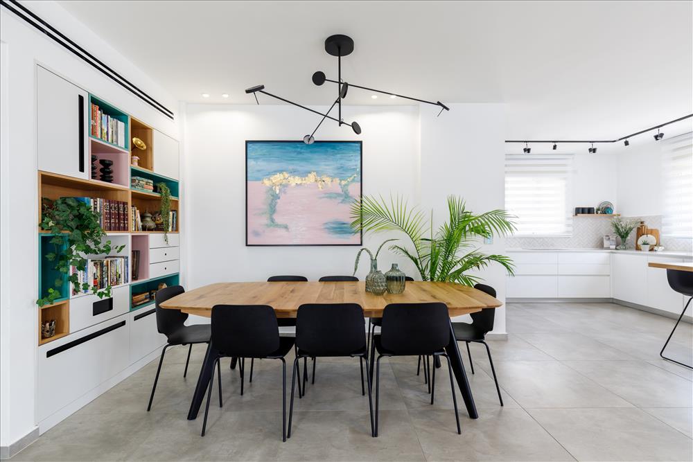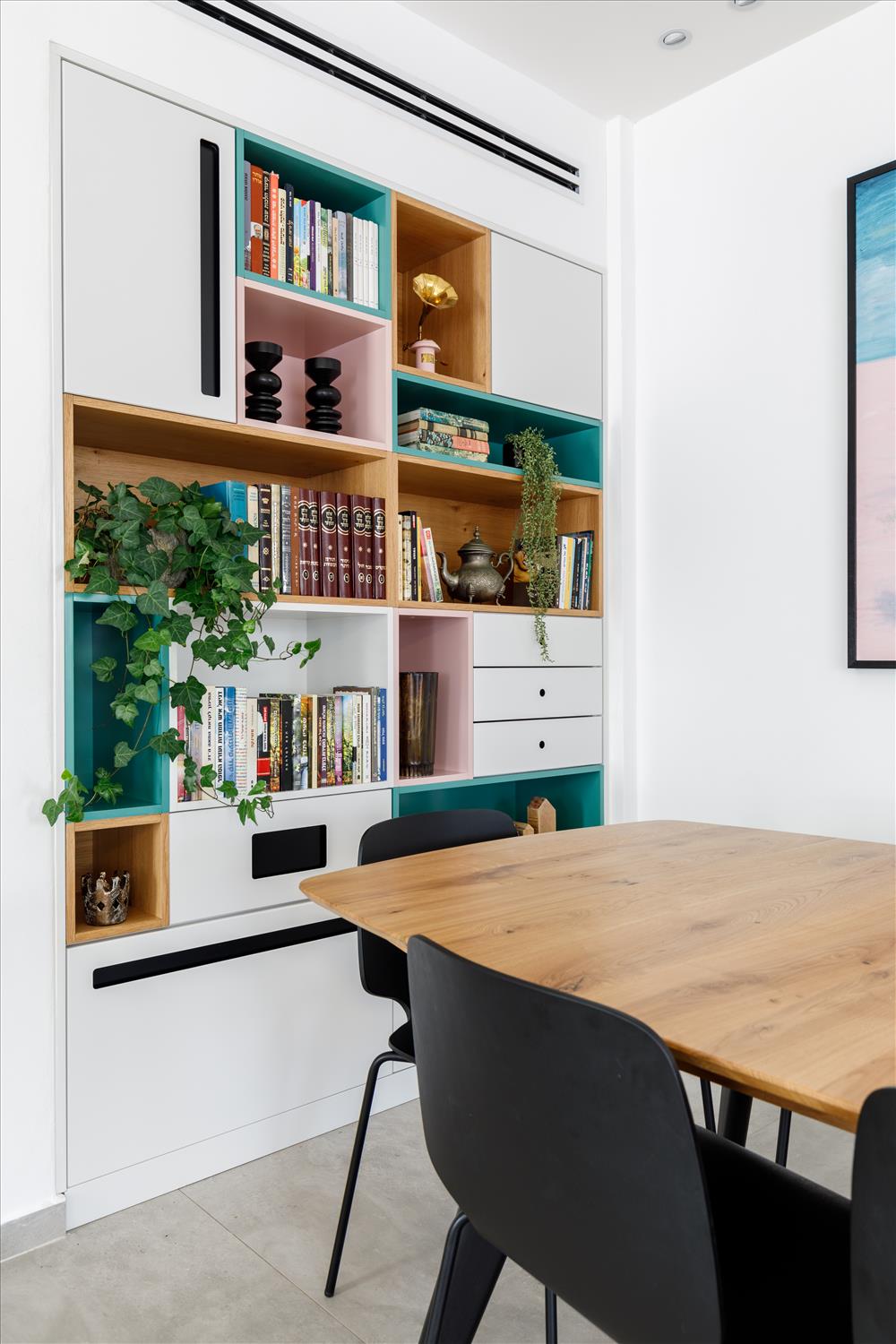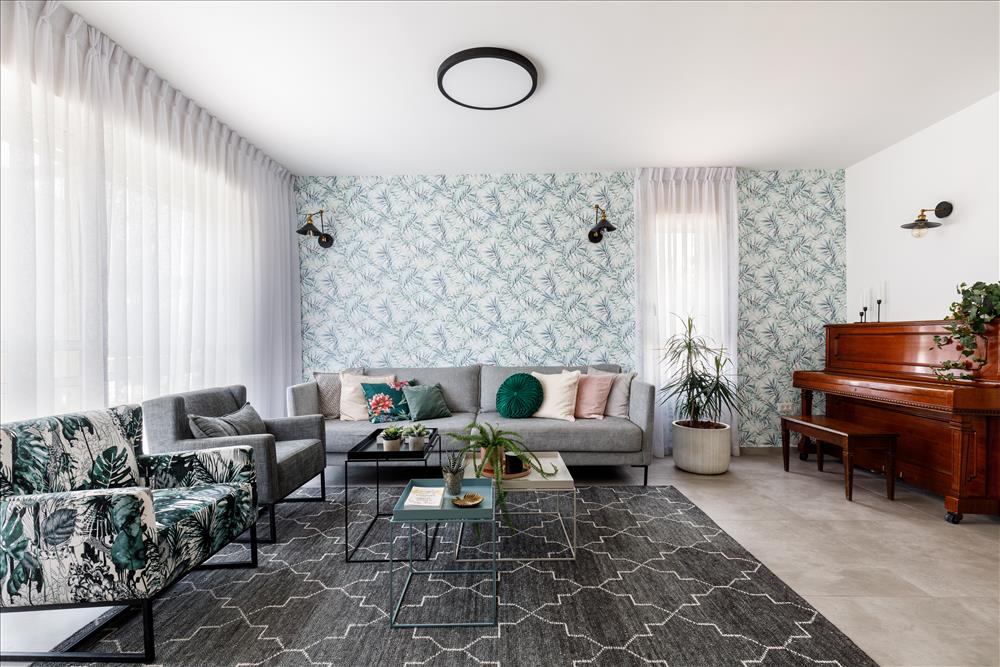 תכננו חלל שאין בו טלוויזיה לפי בקשתם ובמקומו עומד פסנתר ישן שליווה אותם במשך השנים שילבנו אותו בחלל בצורה הרמונית מבלי לפגוע בסגנון העיצובי, בחרנו בריהוט קליל, מודרני וצעיר שילבנו בפינת האוכל נגרות לספריית קודש לא סטנדרטית עם שילובי צבעים צעירים ומרעננים משם המשכנו לבחור את כל הגוונים שיהיו בבדים, בחיפויים, בחומרים ובטקסטורות.