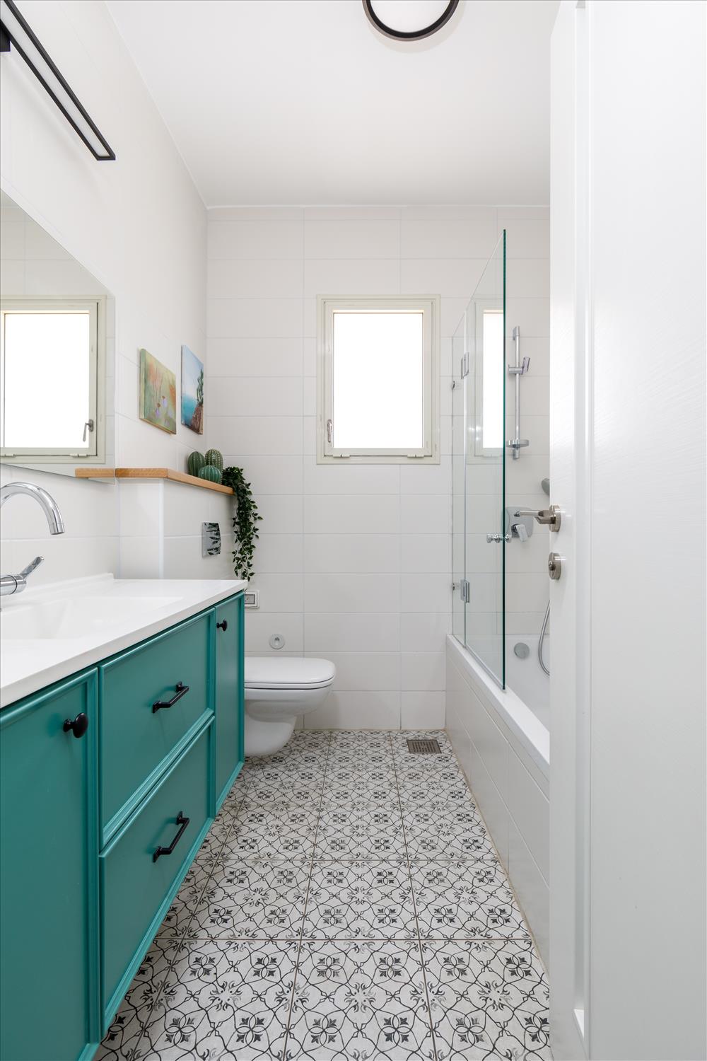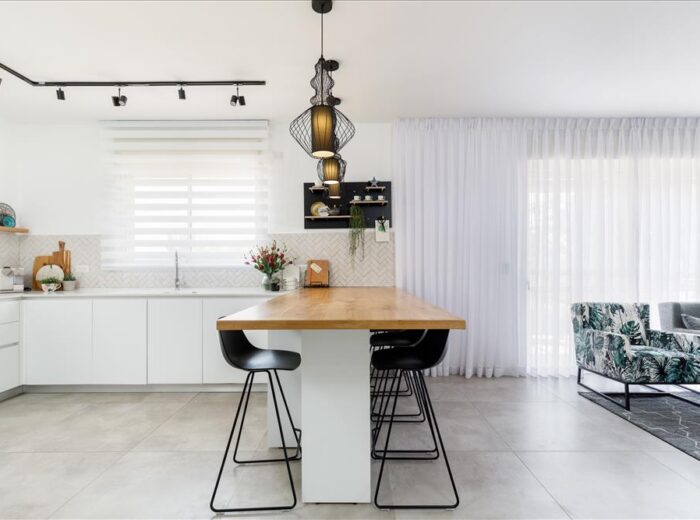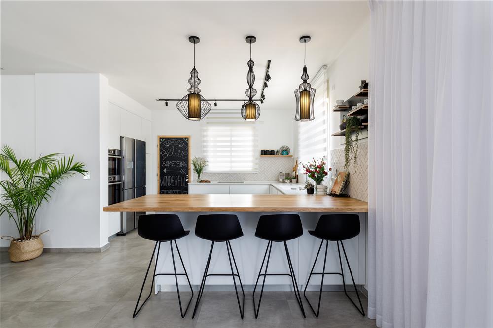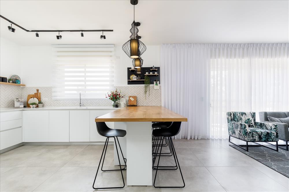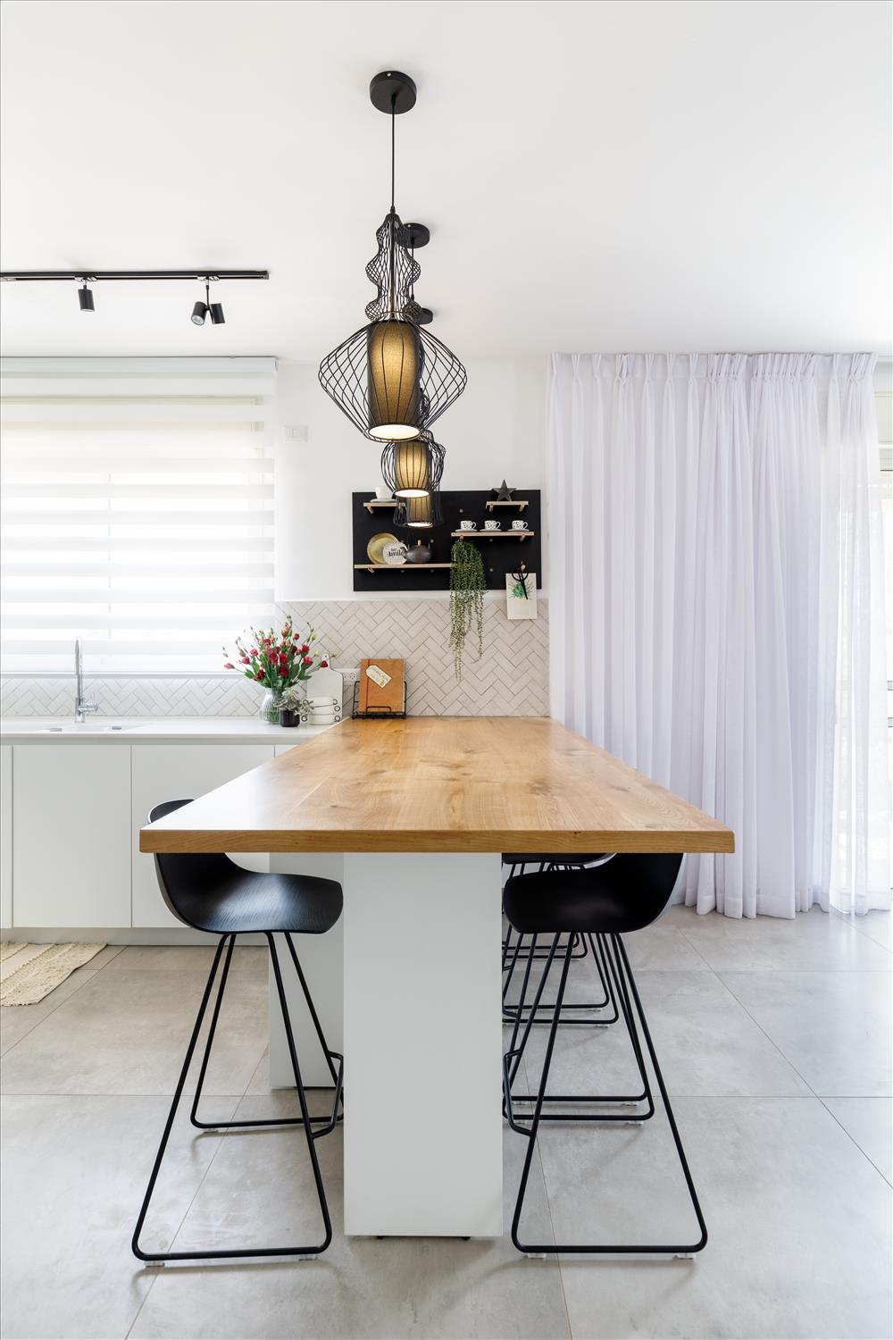 את המטבח הלבן והסטנדרטי שידרגנו עם אריח מיוחד בצורת פישבון הוספנו תאורה יפה ואקססוריז מעל האי, שימו לב ללוח המגניב שבעל הדירה הכין לפי התכנון שלי על מנת לכסות את הדלת שהפריעה למראה העיצובי במטבח, הלוח מייצר המשכיות למטבח וחיבור לקונספט שלו, גם פרקטי וגם יפה.