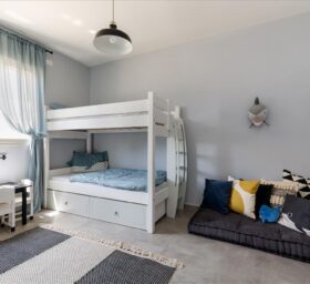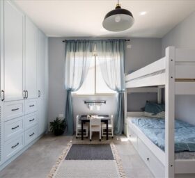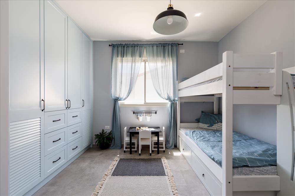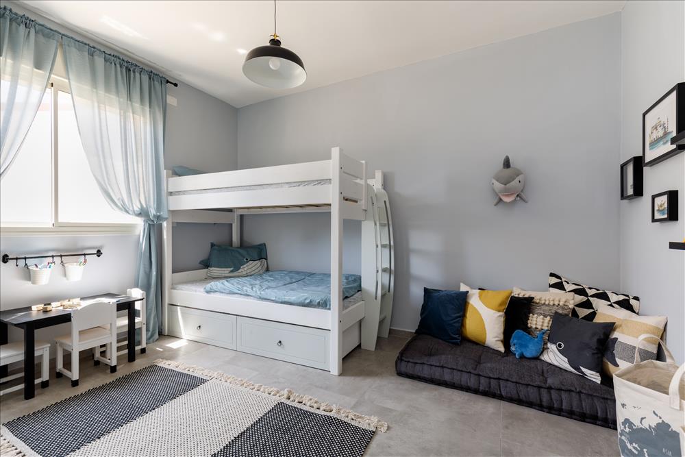 בחדר של הילדים היה לנו חשוב להכניס את כל הפונקציות הנדרשות מפאת חוסר מקום וחדרים נוספים בבית, החדר מספיק גדול וחשבנו איך למקסם אותו בצורה הכי נכונה ולכן חשבנו על מיטת קומותיים, פינת רביצה לקריאת סיפור לפני השינה ופינת יצירה.
