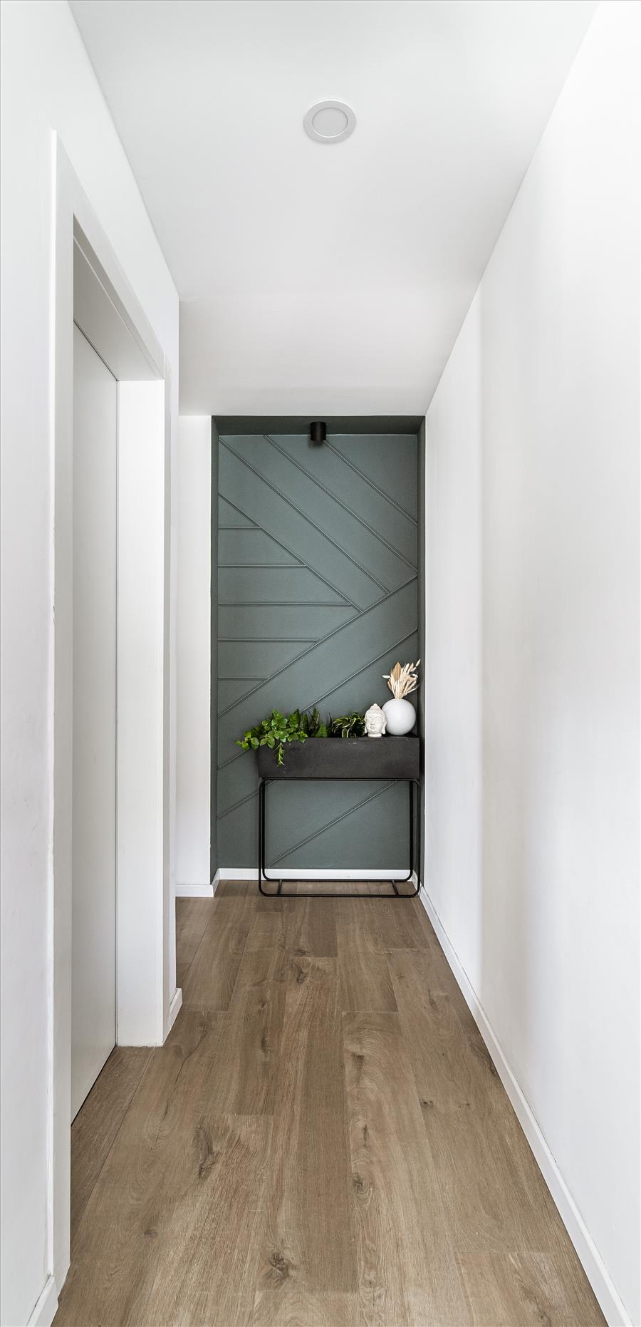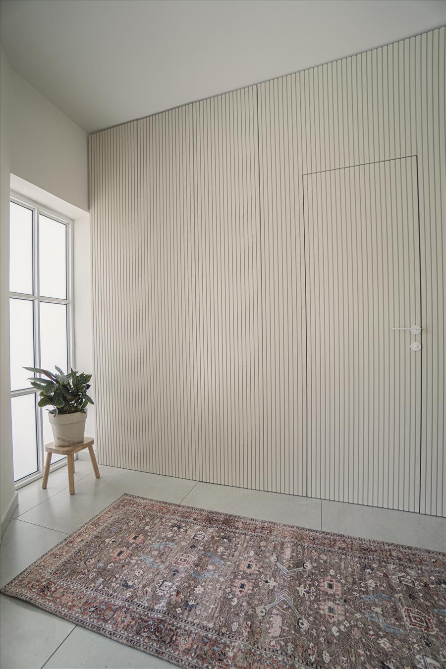 האלומיניום הגס הוחלף בפרופילי ברזל דקיקים, הכניסה הפכה מקיר עם ארונות ודלת לשירותים לקיר יפיפה ואחיד החמם את האווירה בחלל המרכזי ולסיום נבחרו פרטי ריהוט, תאורה ואומנות שישלימו את התמונה החדשה של הבית הזה