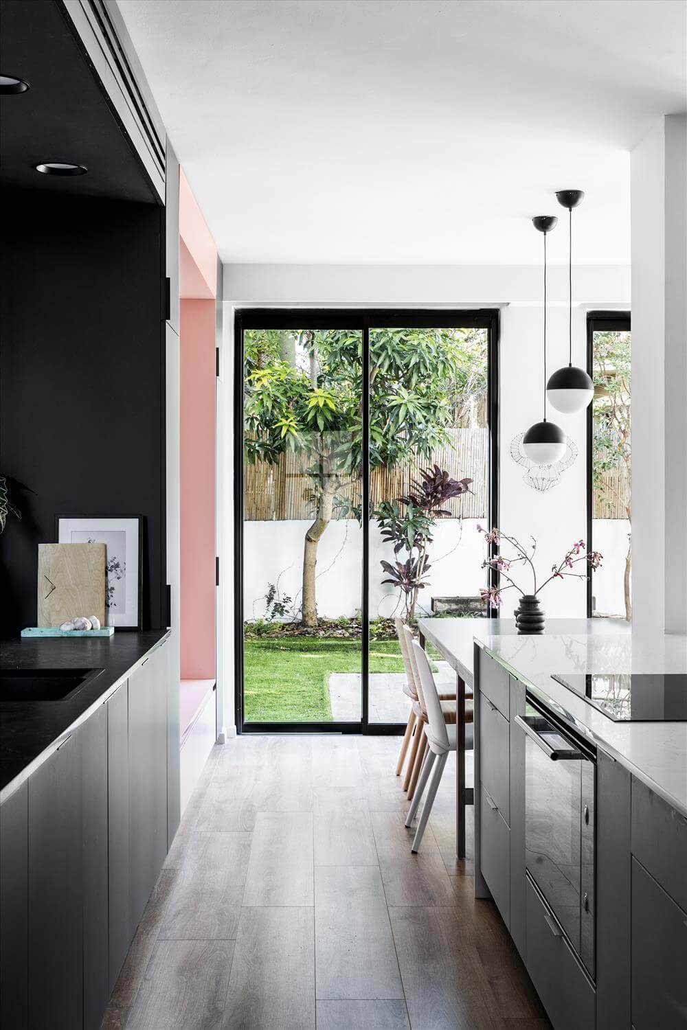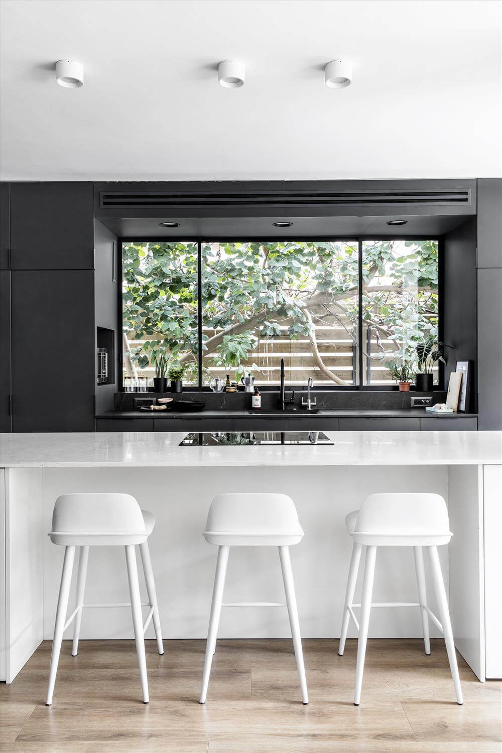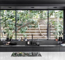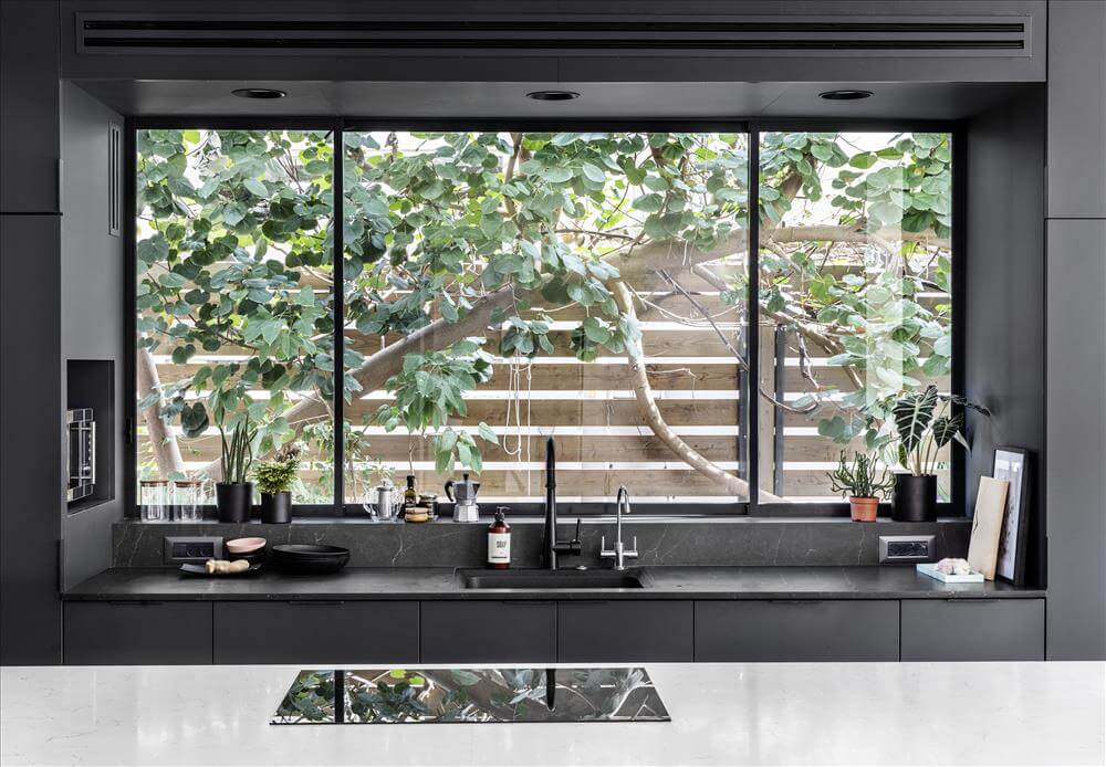 דבר חשוב נוסף בתכנון, הוספו פתחים והקיימים הוגדלו ומוקמו מחדש במיקומים המחמיאים לגינה ולמתבונן בה מבפנים, מהסלון ומהמטבח.