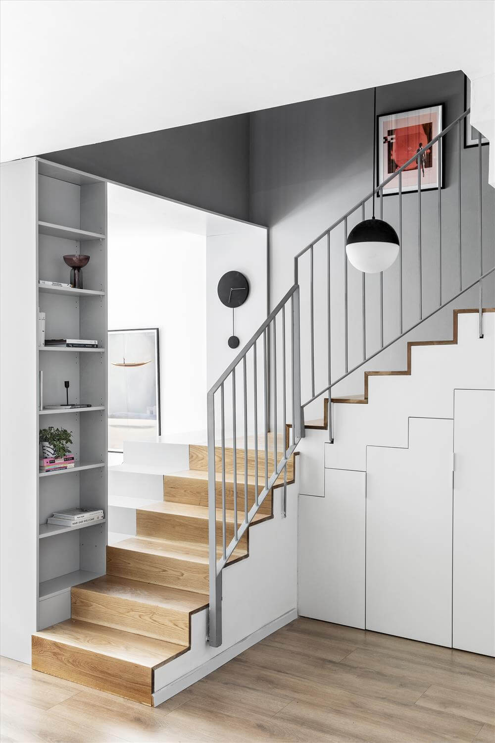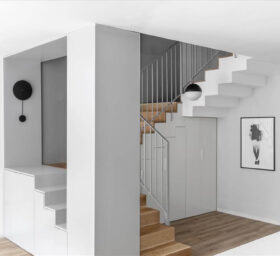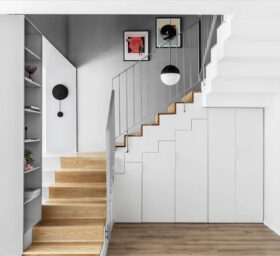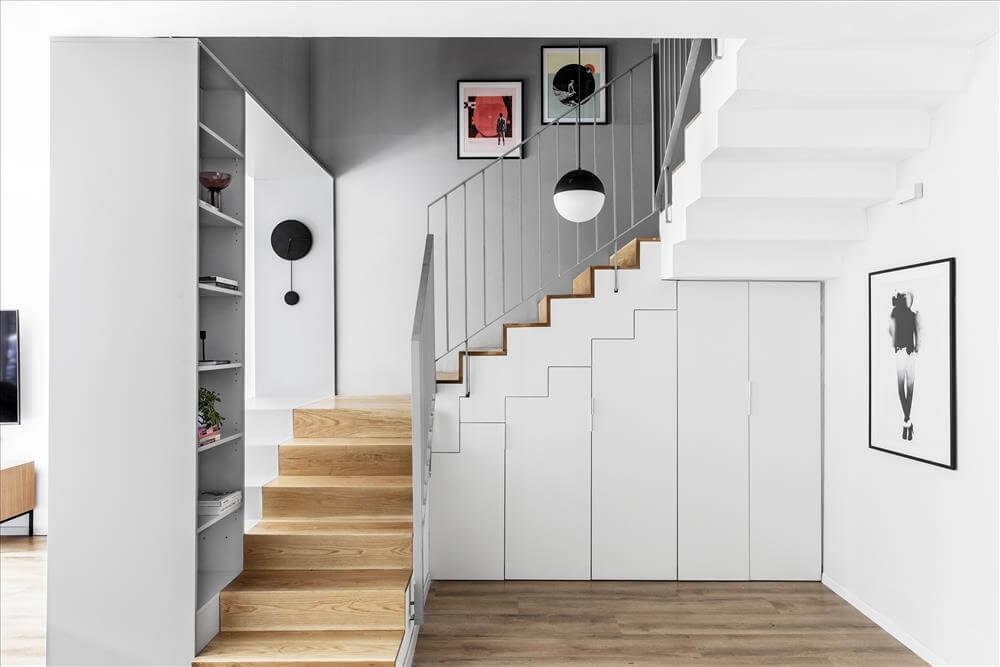 גרם המדרגות חופה בעץ תואם לפרקט בכלל הבית, ו"סגר" את הנגרות בקו אפס מתחתיו, ובכך לא הפריע לגאומטריה ואף תרם לה. הנגרות כאמור, אפשרה אחסון רב וזמין לחפצים שבשימוש תדיר ותרמה רבות לתחושת הסדר והרוגע בבית וכמובן למראה השיקי של הקומה.