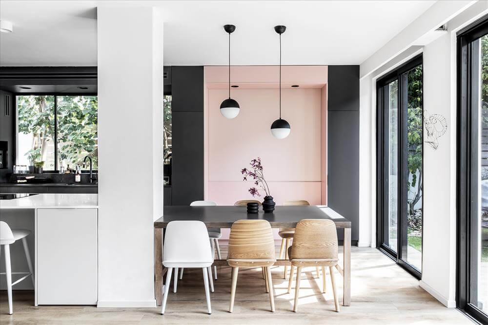 הדבר הראשון בו טיפלתי היה סיבוב כיוון דלת הכניסה ב 45 מעלות מאלכסונית לבעלת מבט בקו ישר אל החוץ, לגינה הירוקה , מעשה שהפך את חלל המגורים לפתוח ושטוף אור מרגע הכניסה.