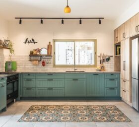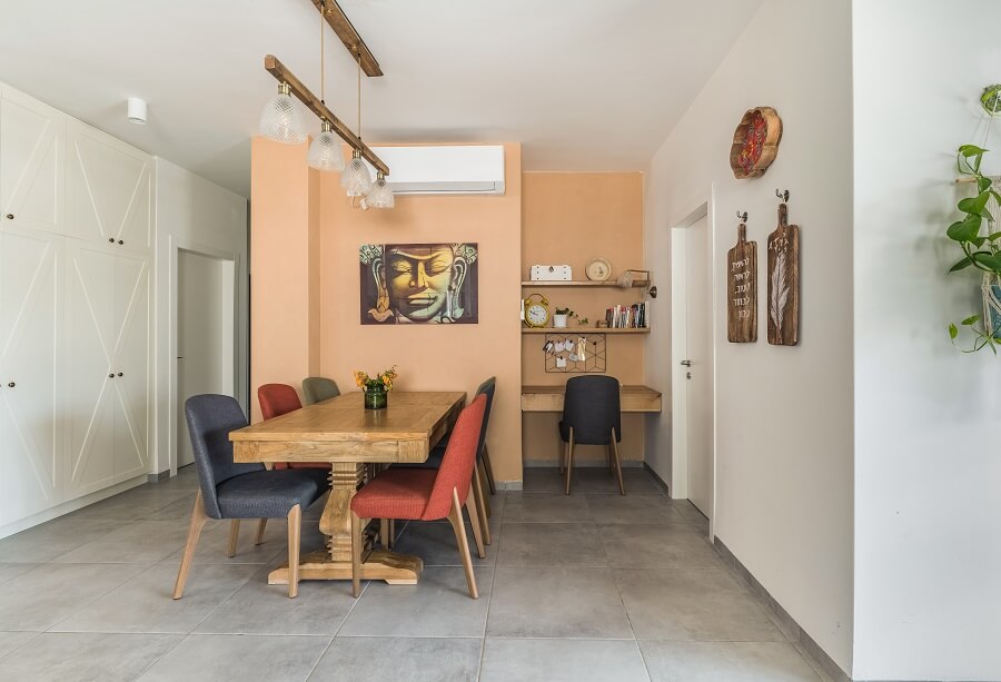 מיקום פינת האוכל נמצא בקשר עין עם הסלון והמטבח. יש אפשרות לייצר פתיחה רחבה בעת אירוח. מיקומו יוצר קשר עין עם כל איזורי הבית , פינת עבודה סלון ומטבח. המטבח קיבל גוון ירוק כחול המשתלב עם חומר העץ ועם אביזרי מטבח ותאורה שחורים..