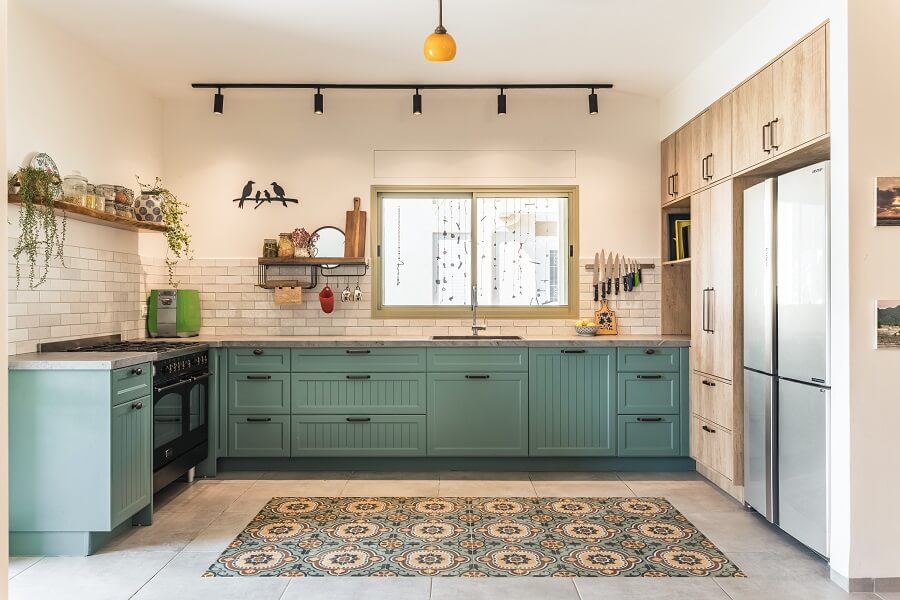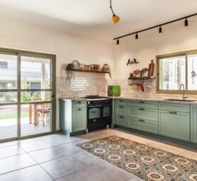 גוון האלומיניום, דלת הכניסה ומעטפת הבית נבחרו בצבעי הירוק מרווה מה שמוסיף עוד נגיעת צבע שאהובה על הדיירים.