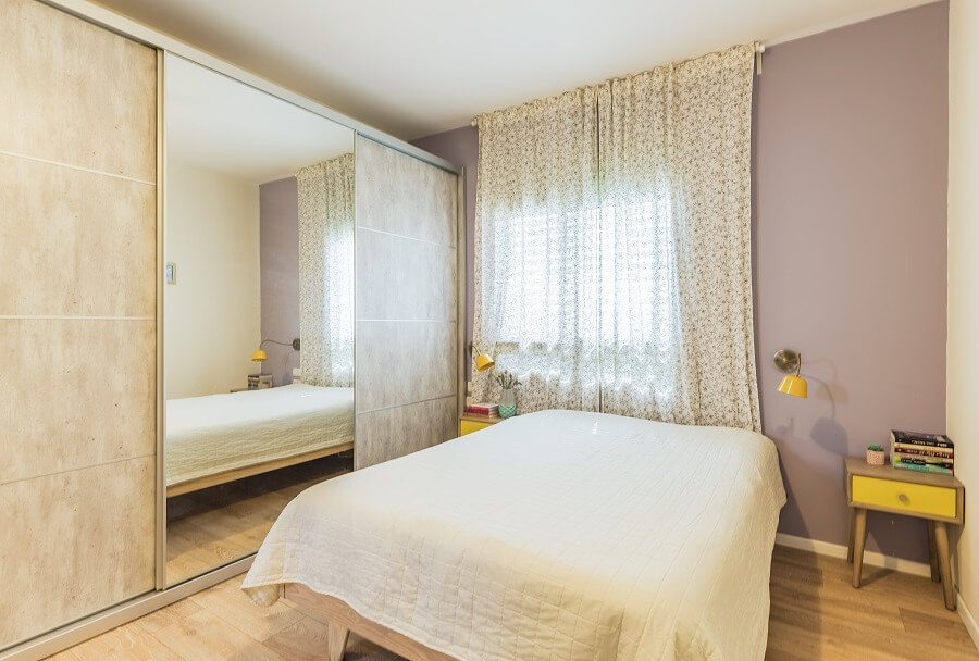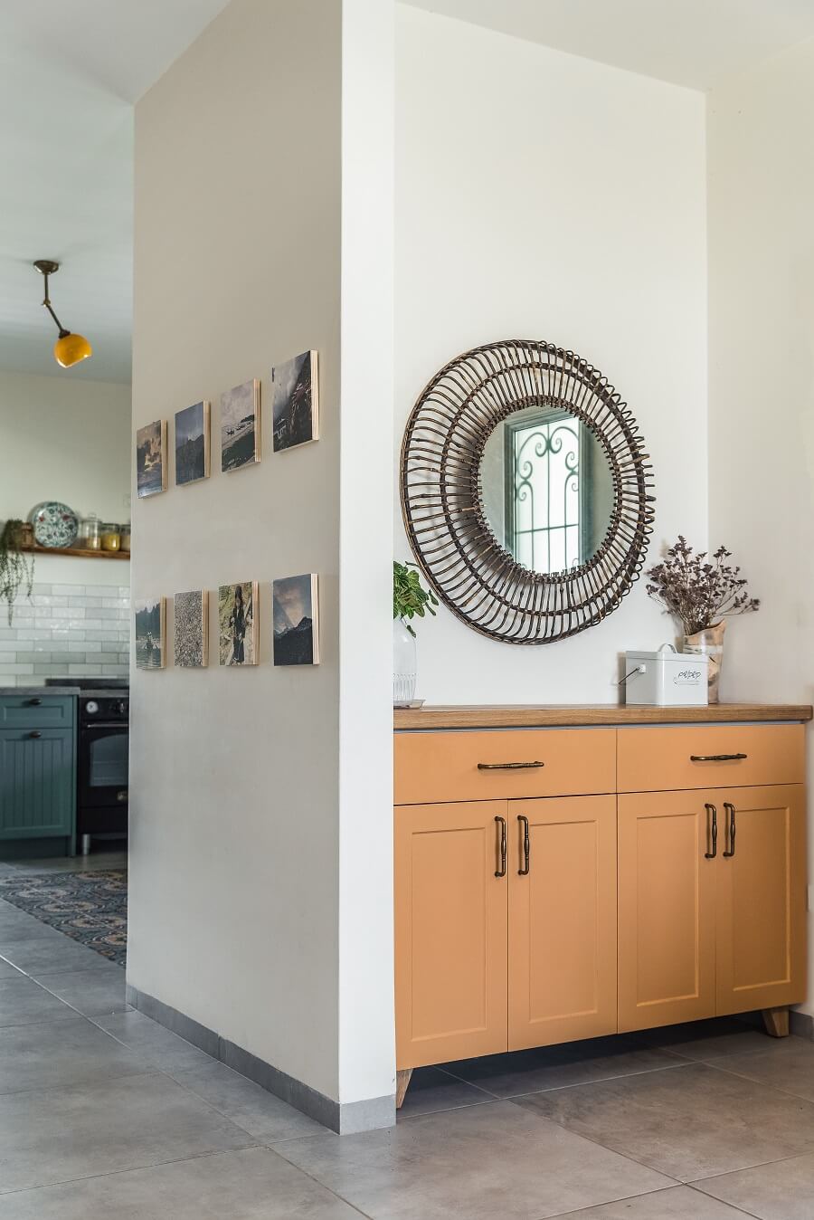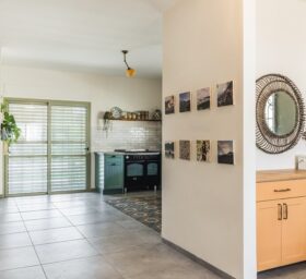 המסדרון המוביל לחדרי השינה נוצל אף הוא לאיחסון. וקיבל את צבעי קירות הבית על מנת להוריד עומס ויזואלי ולמנוע תחושת צפיפות.