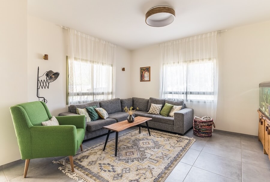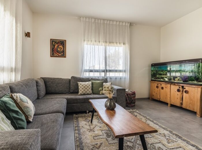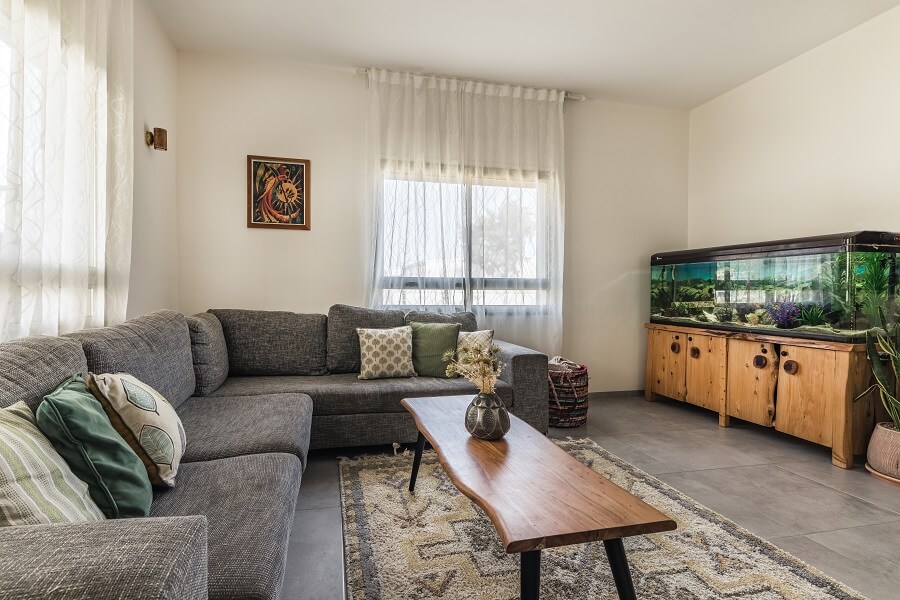 הסלון מרווח הריהוט פשוט ,עמיד פונקציונאלי עם צבעוניות במתחברת לגוונים שנברו לבית ירוקים כחולים ונגיעות של כתום חמרה. מקום מכובד ניתן לאקווריום המשפחתי..