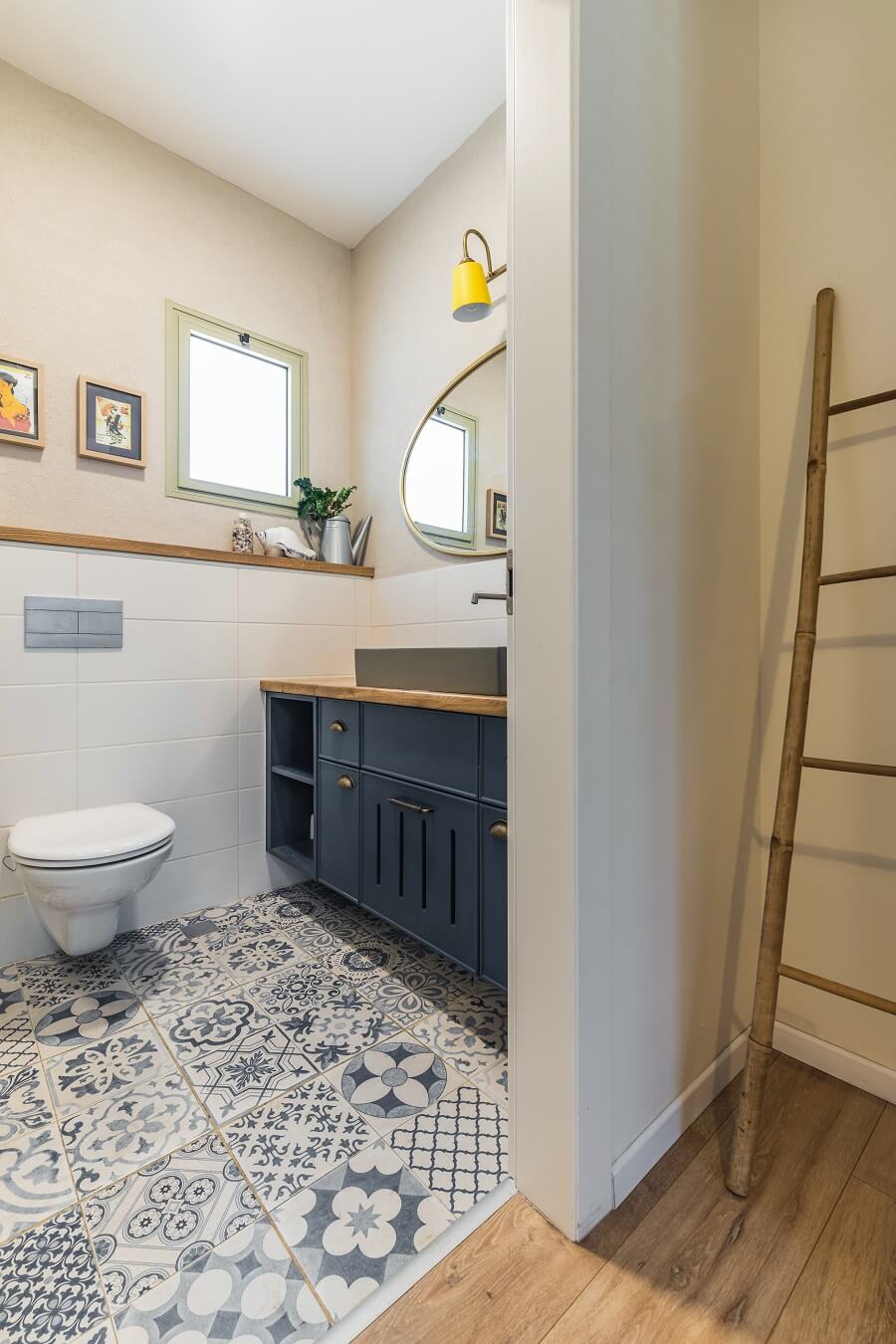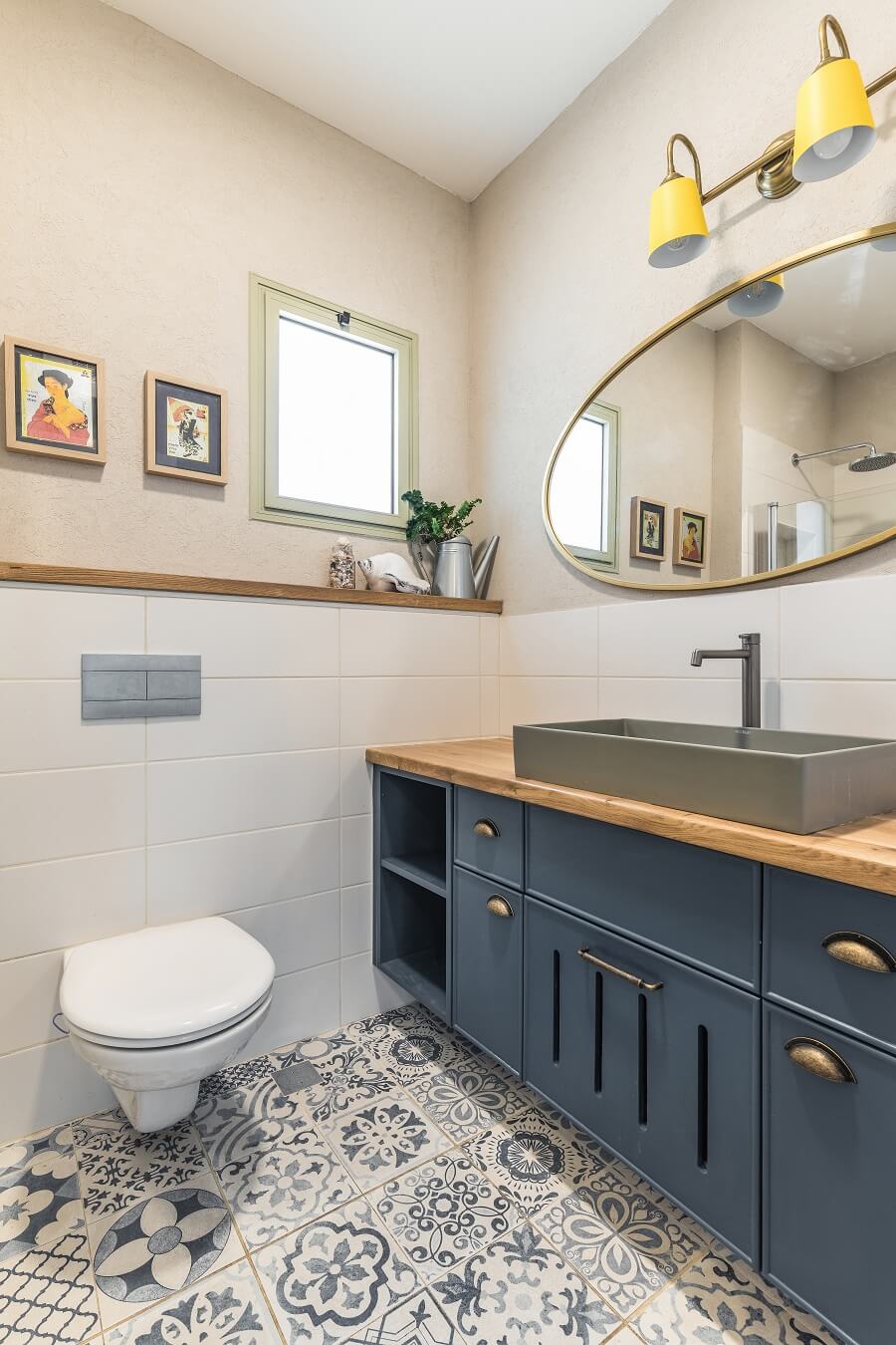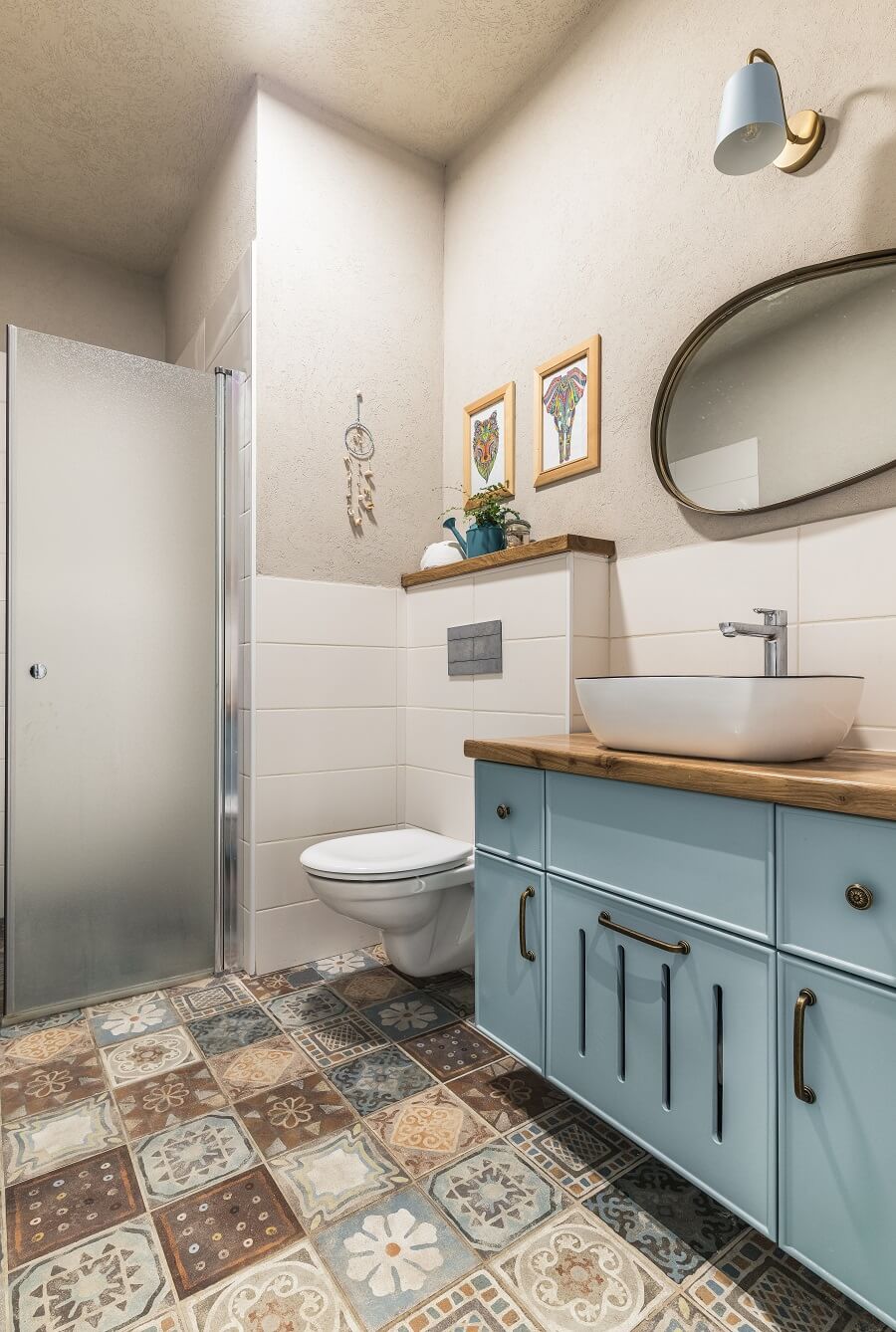 חיפוי המקלחות הינו בגווני לבן שמנת מוקה  והריצפה מרוצפת באריחים מצויירים. מה שמוסיף צבע וקונטרסט הוא בחירת גוון הארונות בכחול מודגש ובמקלחת הילדים בכחול ג'ינס. בכל ארון תוכננה מגרת כביסה שימושית ונוחה.