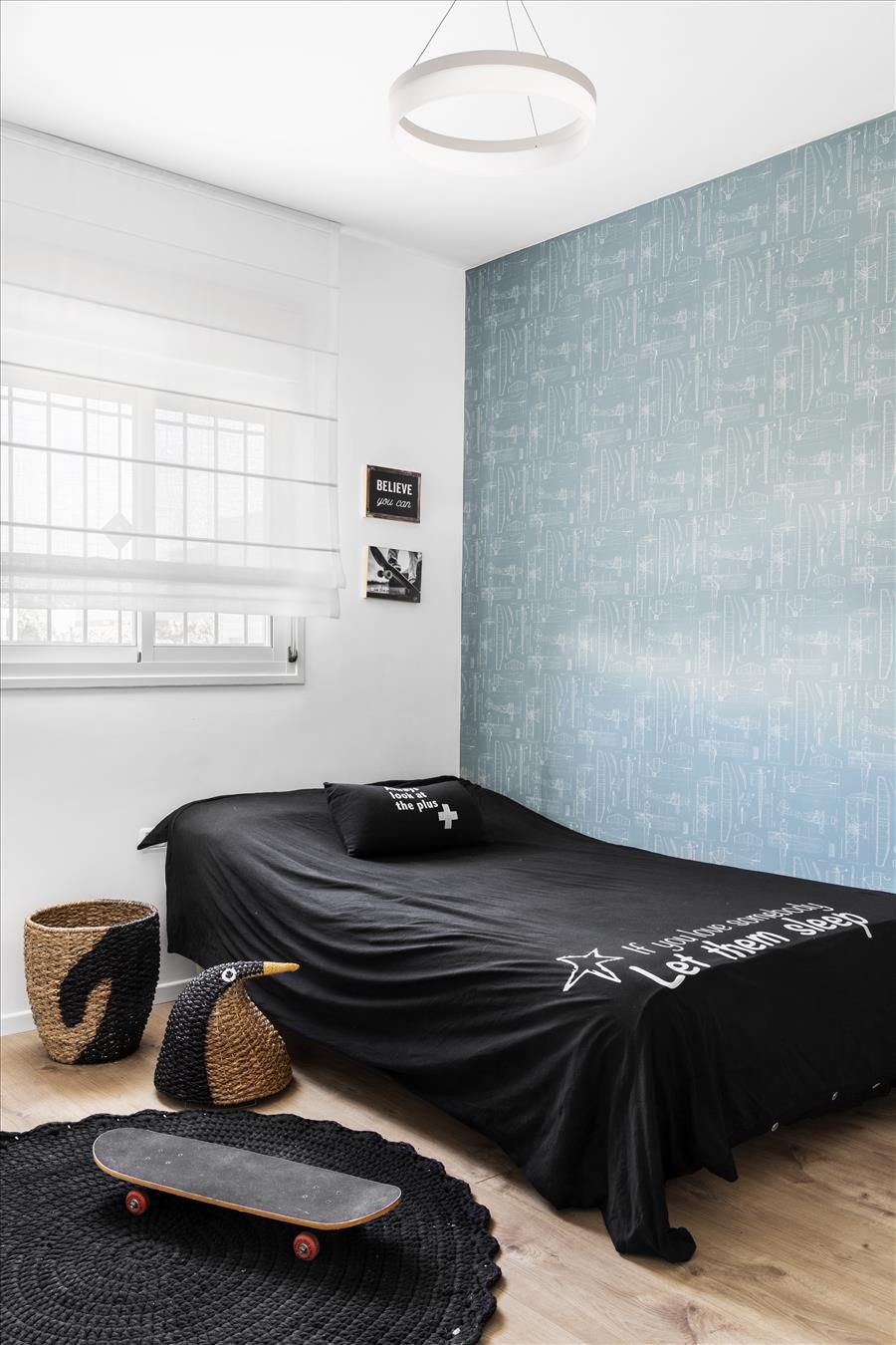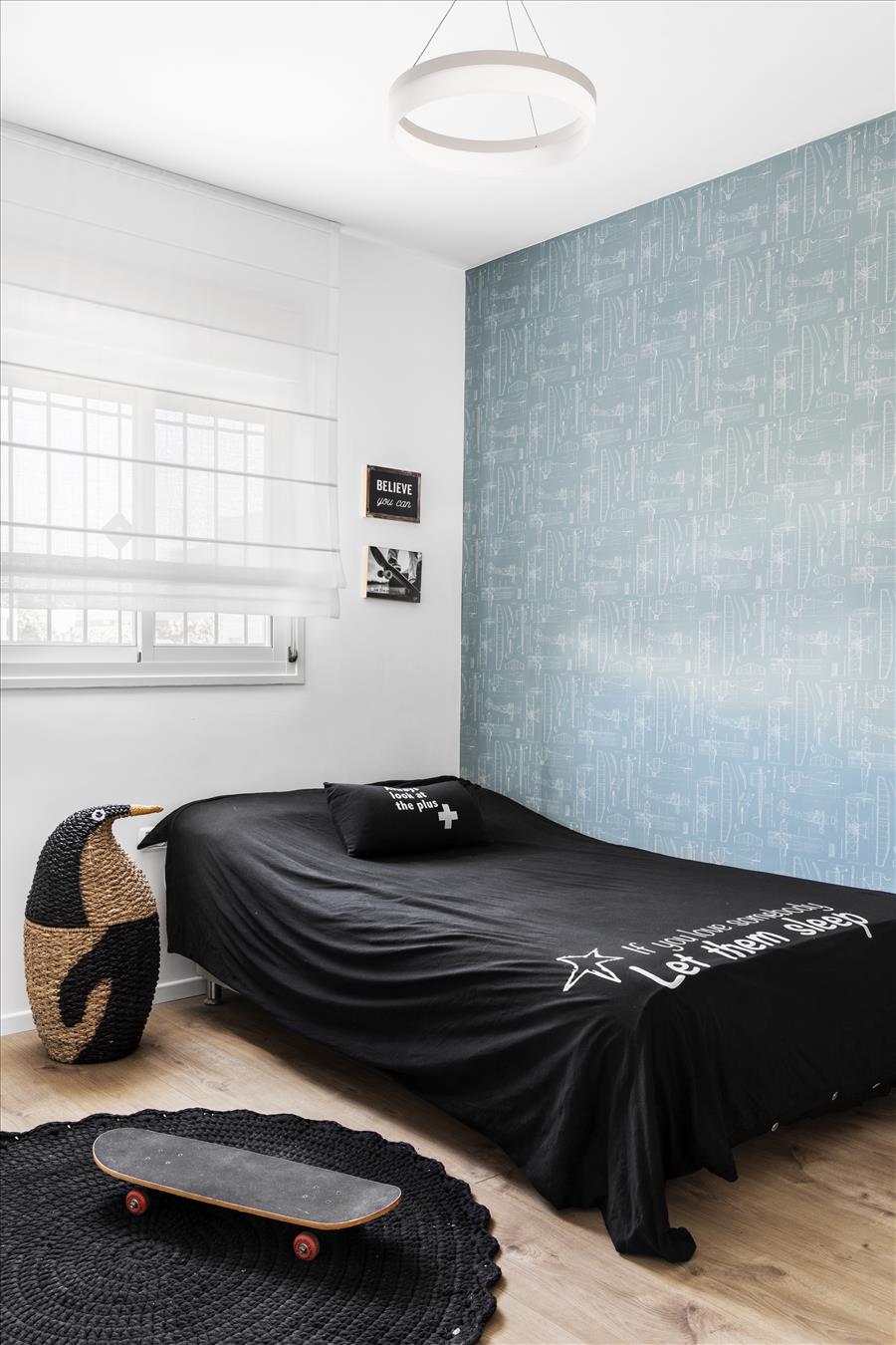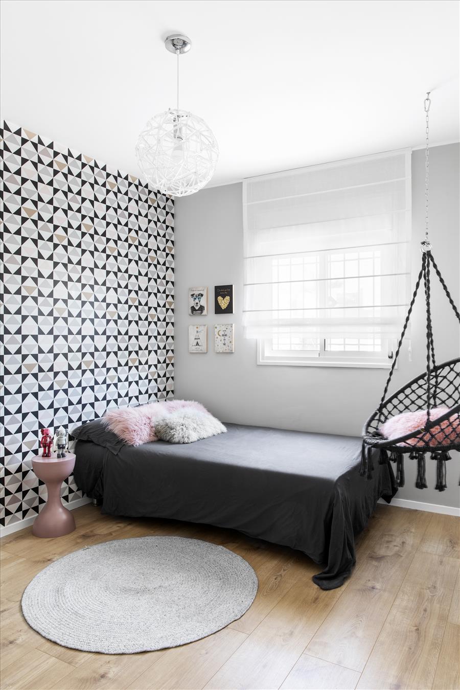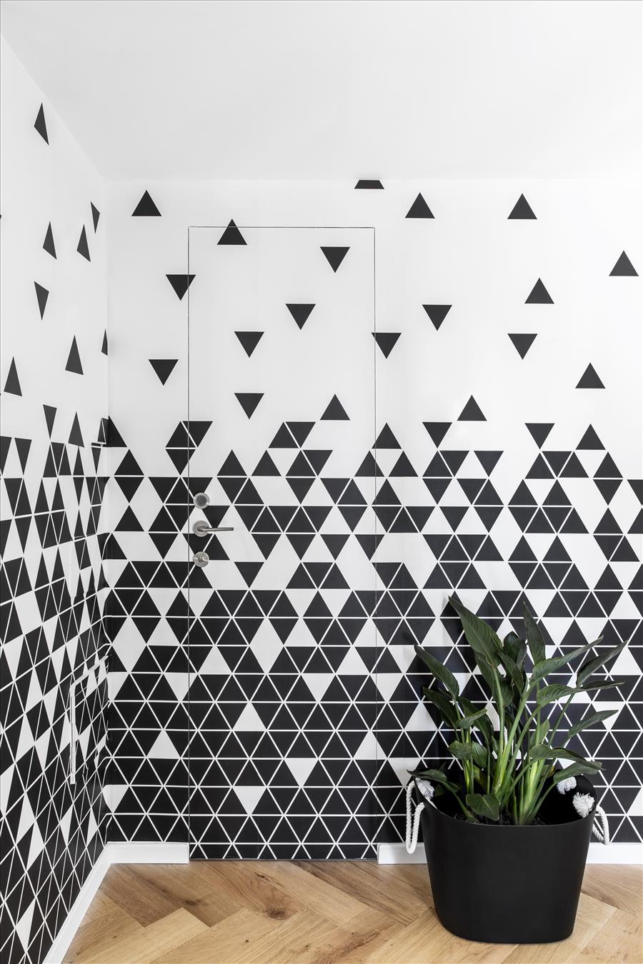 יצירתי  שיעשה WOW בחלל. החלטנו על טפט תמונה שבו יש משולשים שחורים הצפופים בתחתית והולכים  ונעלמים לקראת התקרה. המטרה היתה לייצר תחושת גובה, כדי שהעין   תעקוב אחרי פיזור המשולשים. את הדלת לשירותי האורחים שילבנו בתוך הטפט הזה בזכות דלת עם משקוף בקו אפס וכשהיא סגורה  היא כאילו מוסוות ואינה נראית. הטפט בעצם פתר לנו שתי בעיות הוא גם מסווה וגם יוצר עיצוב ייחודי. אני מכנה אותו טפט אינטליגנטי