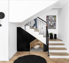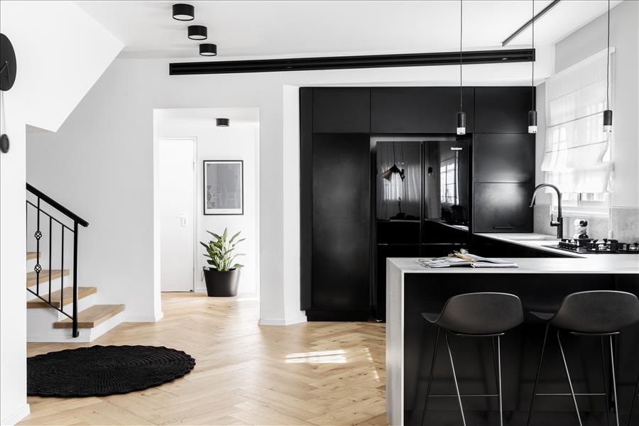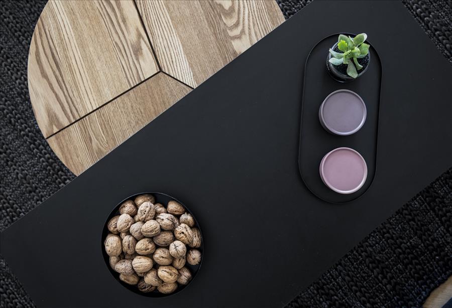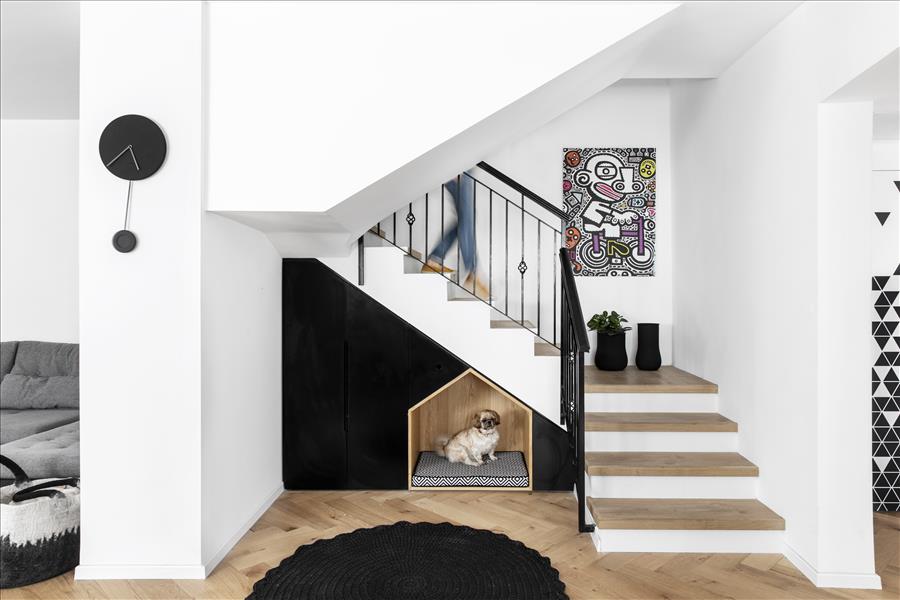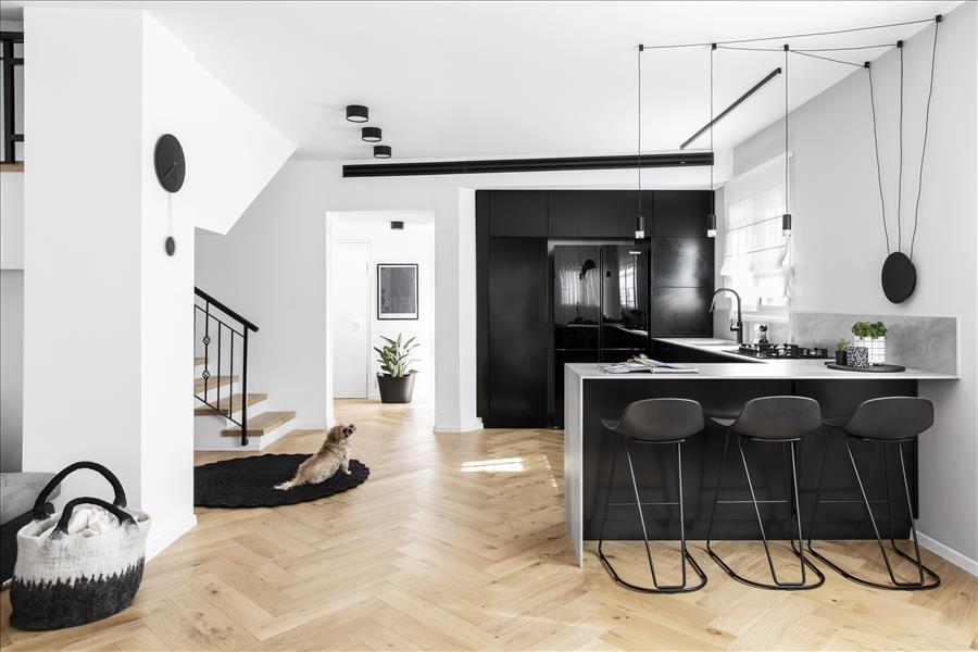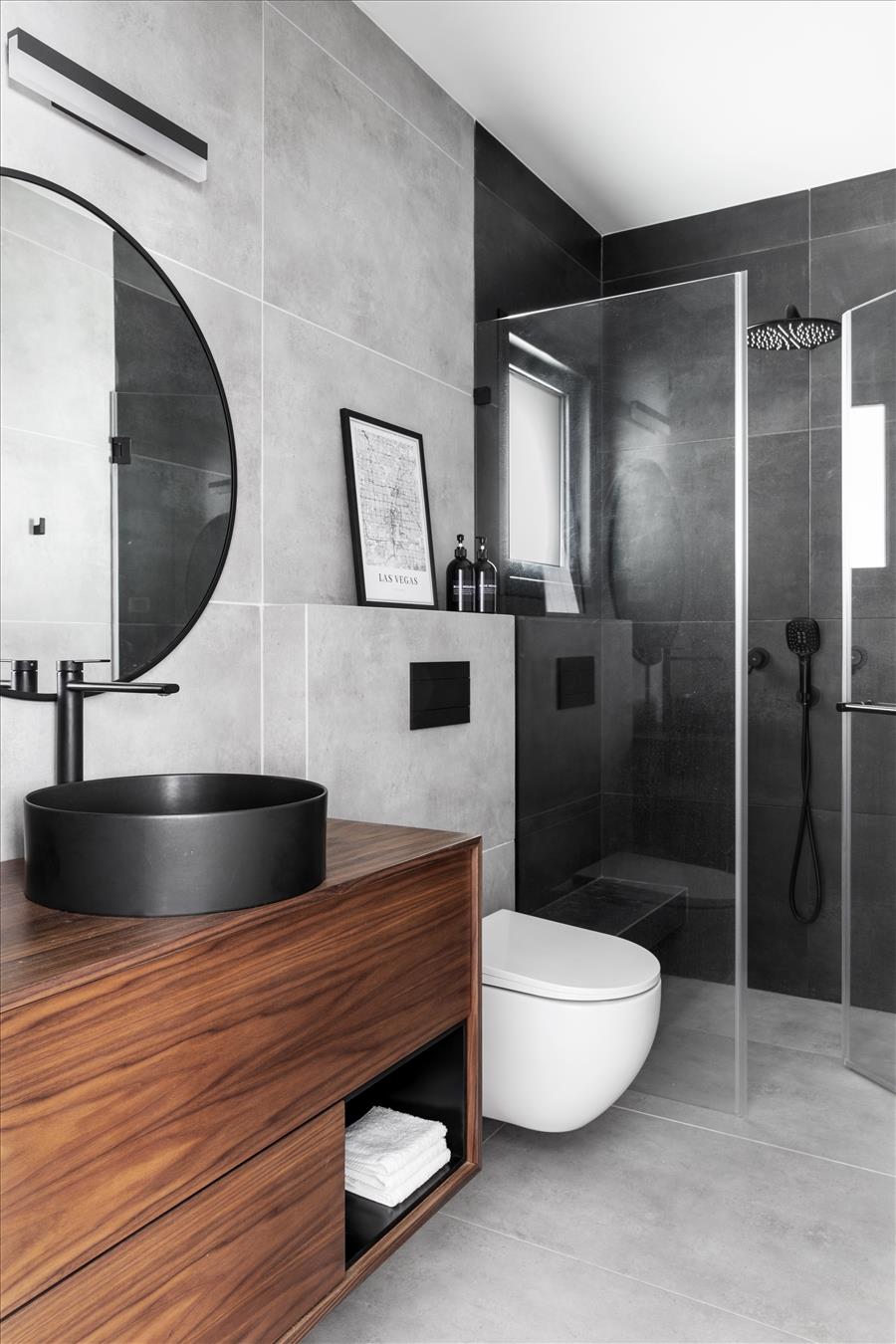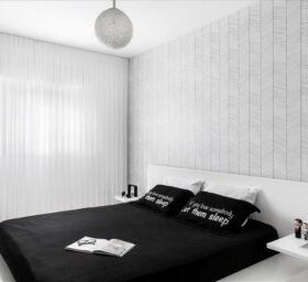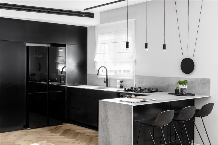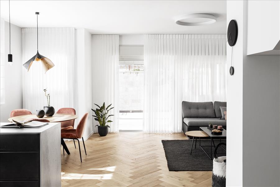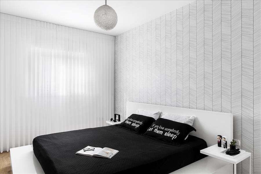 יצירתי  שיעשה WOW בחלל. החלטנו על טפט תמונה שבו יש משולשים שחורים הצפופים בתחתית והולכים  ונעלמים לקראת התקרה. המטרה היתה לייצר תחושת גובה, כדי שהעין   תעקוב אחרי פיזור המשולשים. את הדלת לשירותי האורחים שילבנו בתוך הטפט הזה בזכות דלת עם משקוף בקו אפס וכשהיא סגורה  היא כאילו מוסוות ואינה נראית. הטפט בעצם פתר לנו שתי בעיות הוא גם מסווה וגם יוצר עיצוב ייחודי. אני מכנה אותו טפט אינטליגנטי