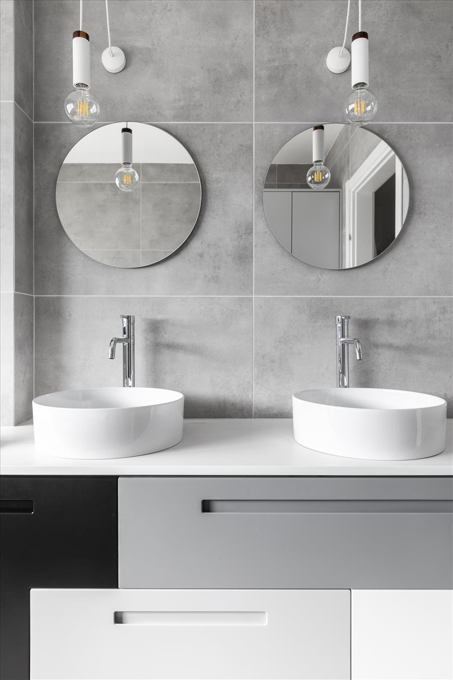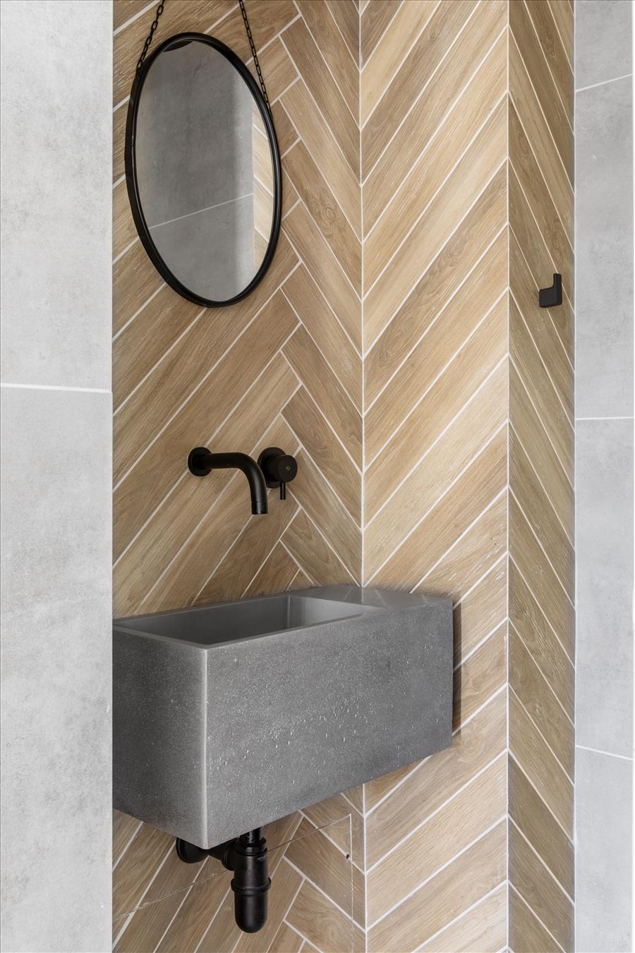 את הקווים האלכסוניים ניתן לראות כבר בפרקט הלמינציה המיושם בדוגמת פיש-בון, זהו ריצוף למינציה בפטנט חדש שהוא עמיד יותר, ופרקטי יותר ומותאם לבית  פעיל עם ילדים.  הריצוף מתפס גם הוא  על קירות שירותי האורחים הקטנים בכניסה לבית אך הפעם באריחי גרניט פורצלן והם עולים עד התקרה ליצירת מראה מעניין ולא סטנדרטי. את המראה משלים כיור בטון קטן עם "חצאית" ופרזול שחור. המוטיב האלכסוני משולב גם בטפט המיוחד בכניסה לבית.