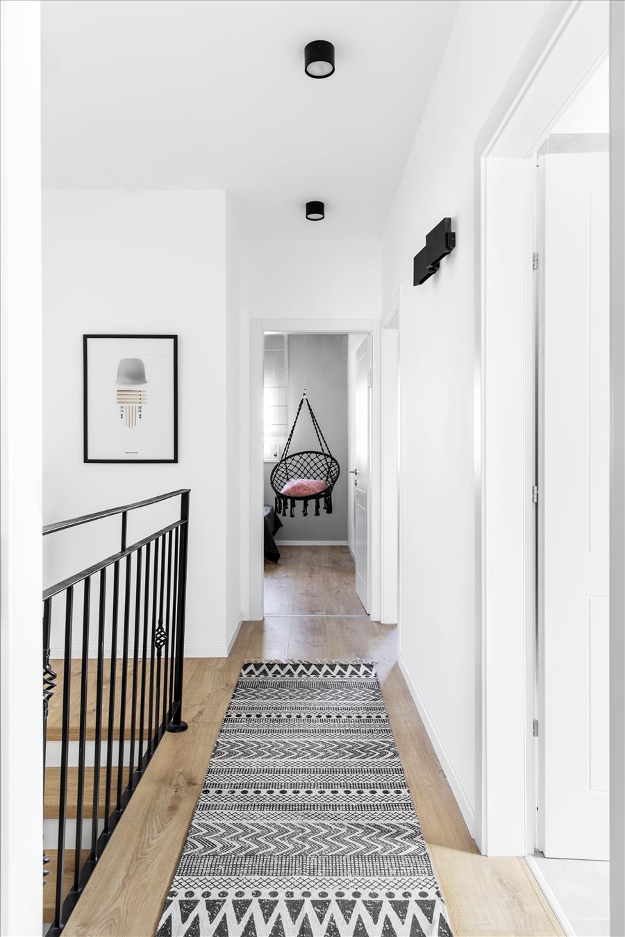 מוטיב עיקרי של קווים האלכסוניים חוזר על עצמו בעיקר בקומה הראשונה של הבית הדו-קומתי.