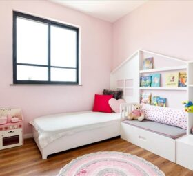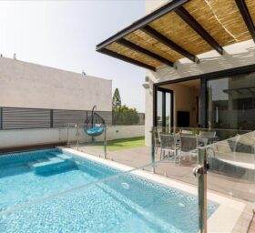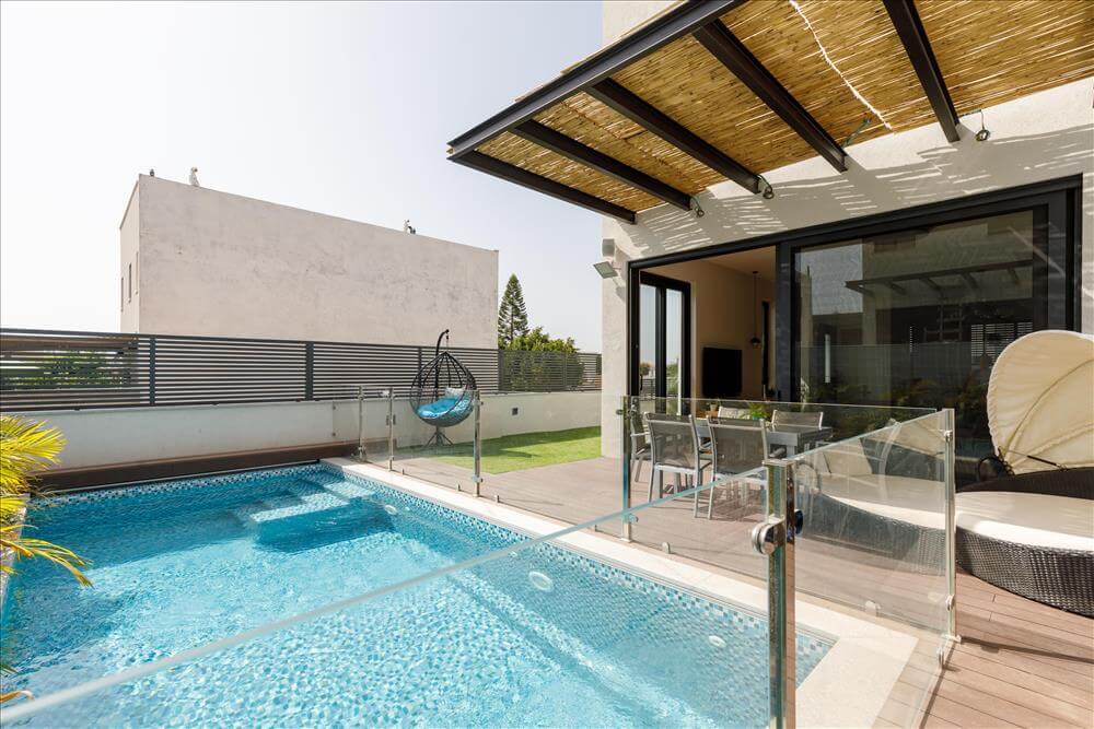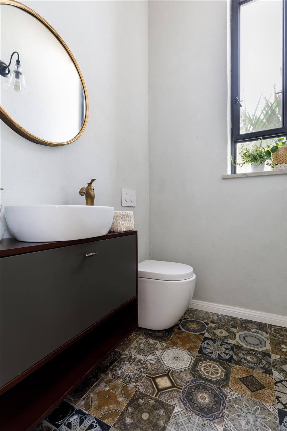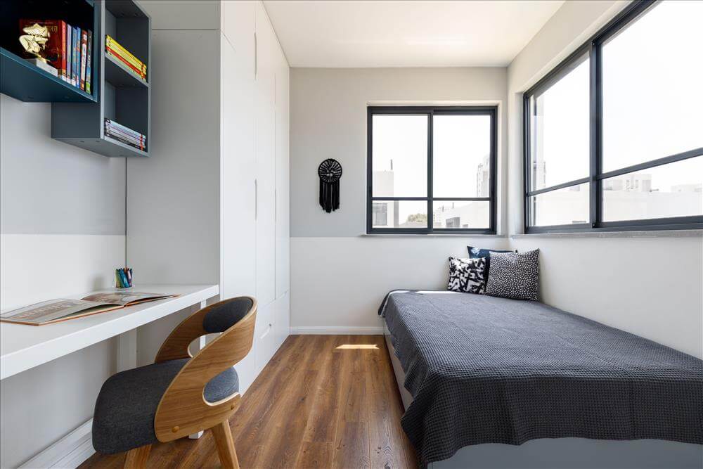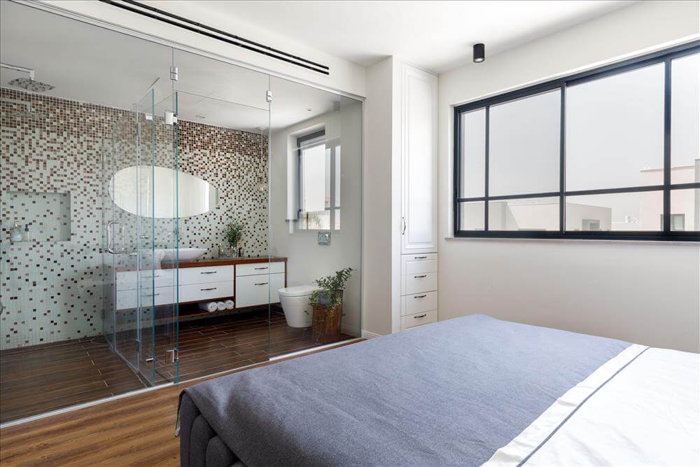 בקומת המגורים סוויטת הורים עם חדר רחצה מיוחד. קיר זכוכית שקופה מחליף קיר בלוקים סטנדרטי, ומשקף את החלל לחדר השינה. פרטי הנגרות תוכננו בקפידה ובהתאמה מדויקת לכל חלל. כל חומרי הגמר לבניה, פרטי הנגרות (כולל המטבח) וכל התכולה הוזמנו, יוצרו ונרכשו בסין בנסיעה משותפת שלי והלקוחה.
