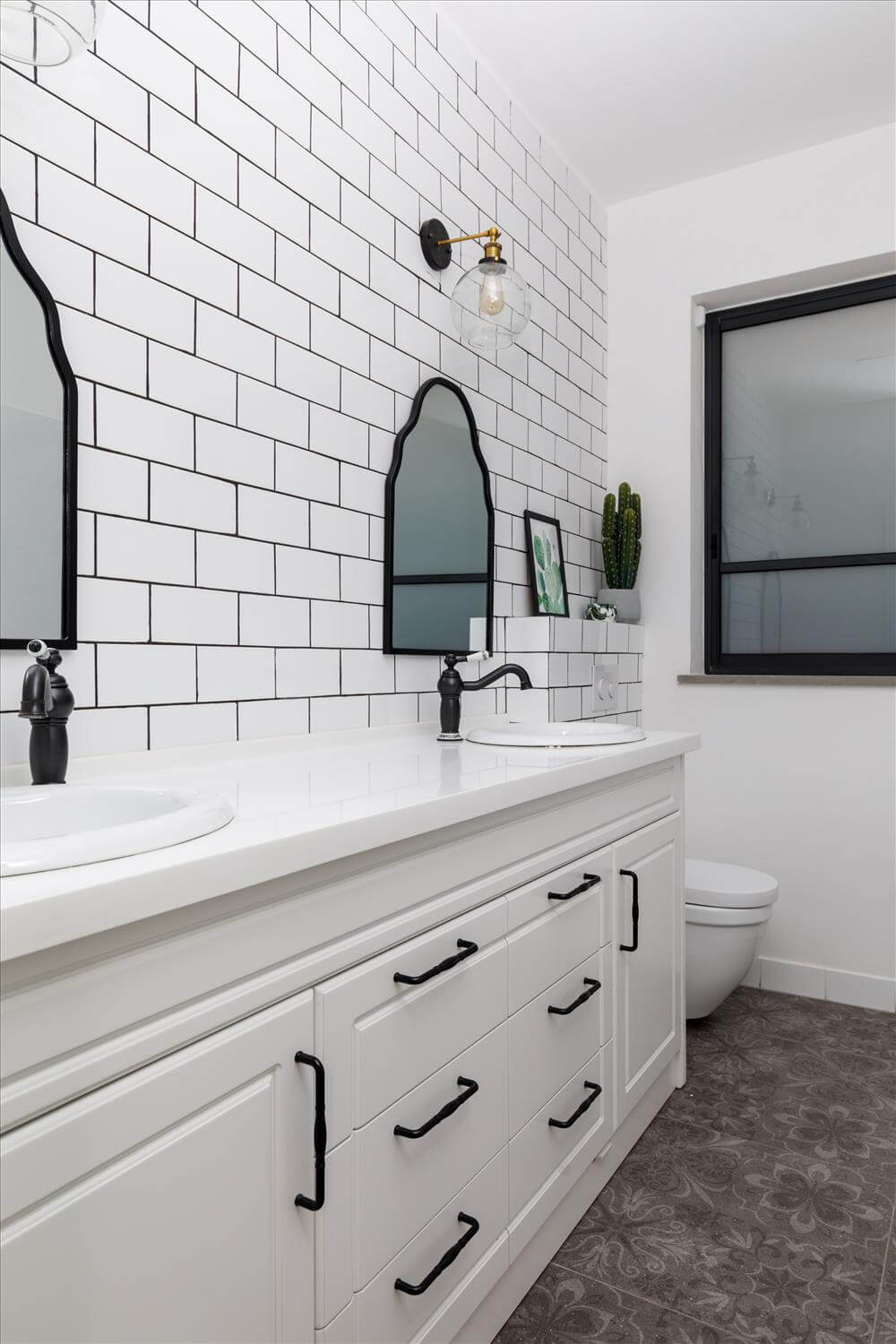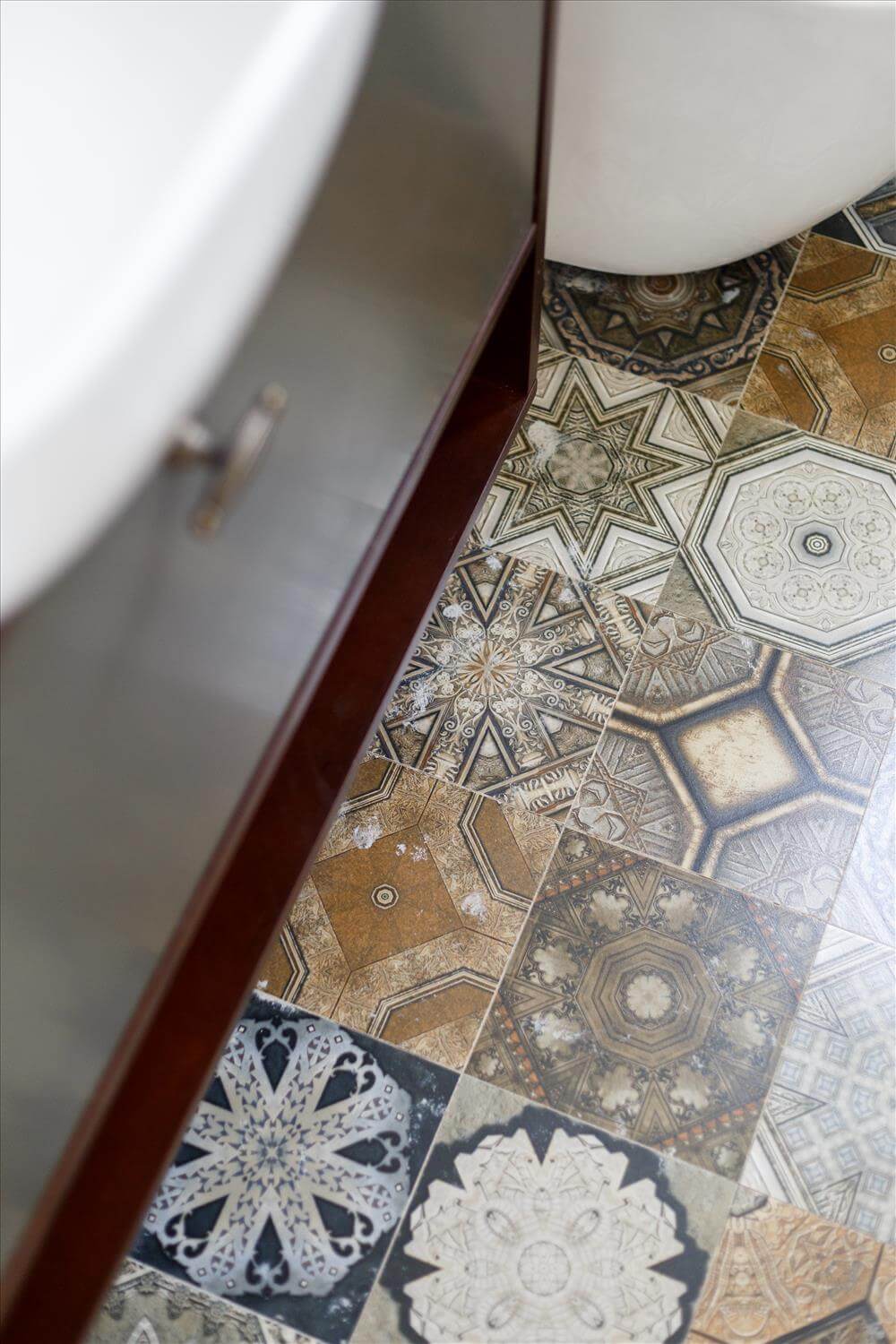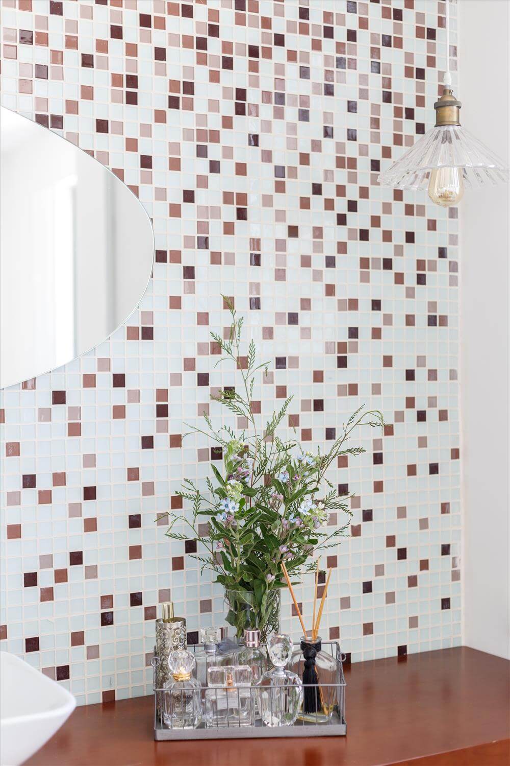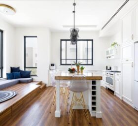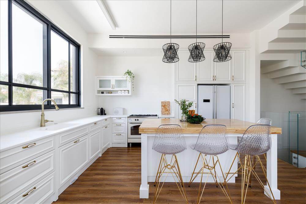 המטבח בסגנון כפרי עדין, בצבע לבן ובמרכזו אי גדול לישיבה ואחסון, ועליו מונחת פלטת בוצ'ר מסיבית.