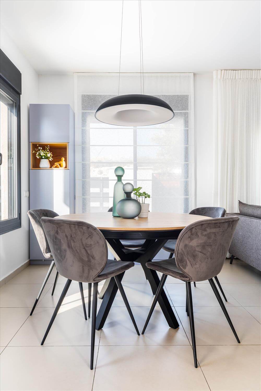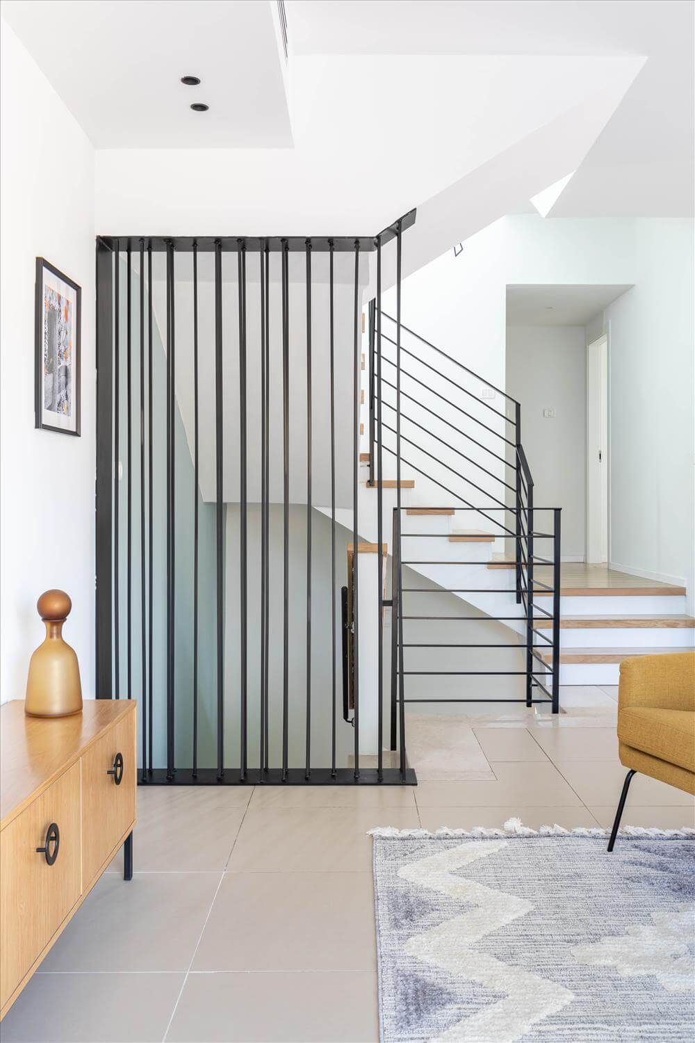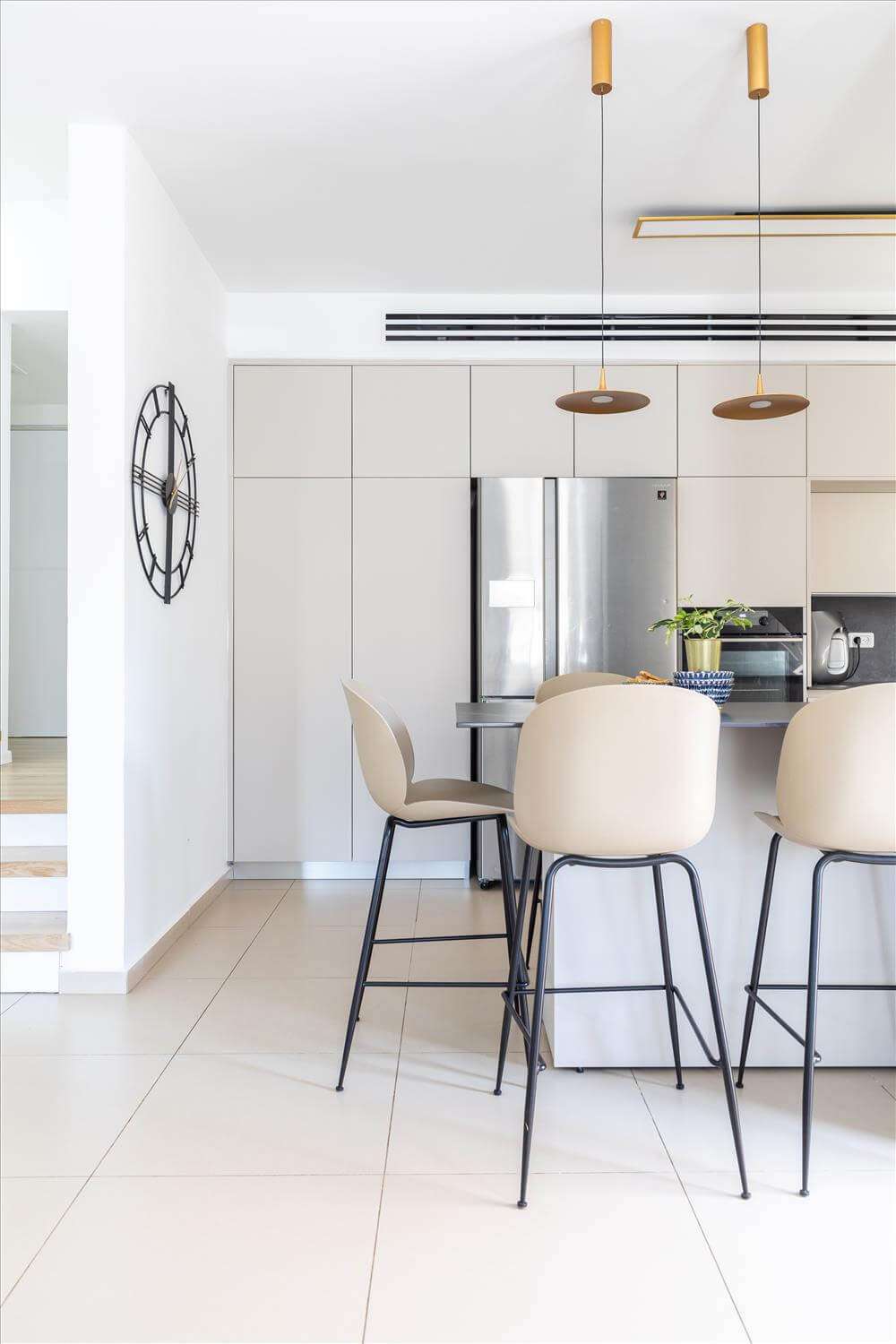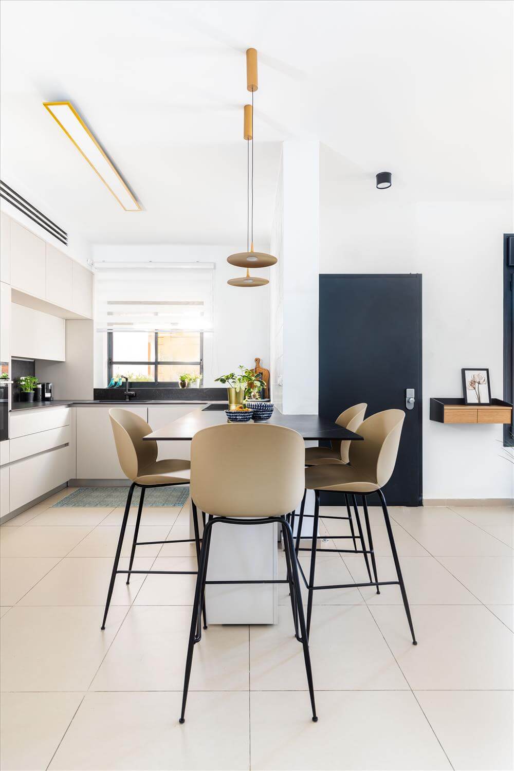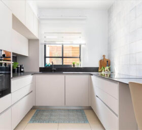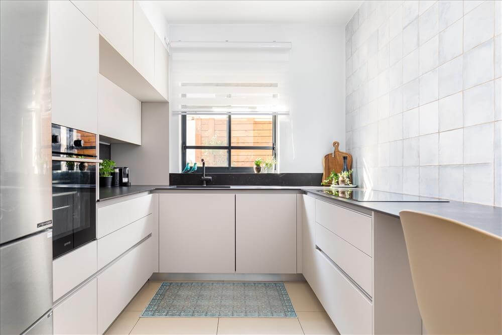 השיפוץ כלל תכנון חדש למטבח והחלפת 2 חלונות צרים וקטנים מעל הכיור בחלון גדול עם אדן פנימית המכניס אור טבעי לחלל. קיר נישות מגבס אשר שימש כמעקה למדרגות ירידה למרתף הוסר ובמקומו תוכנן ועוצב אלמנט ברזל שיוצר חציצה קלילה ופתוחה בחלל.