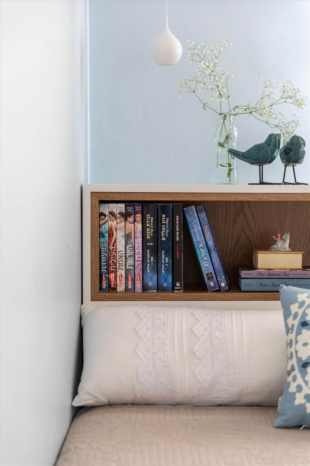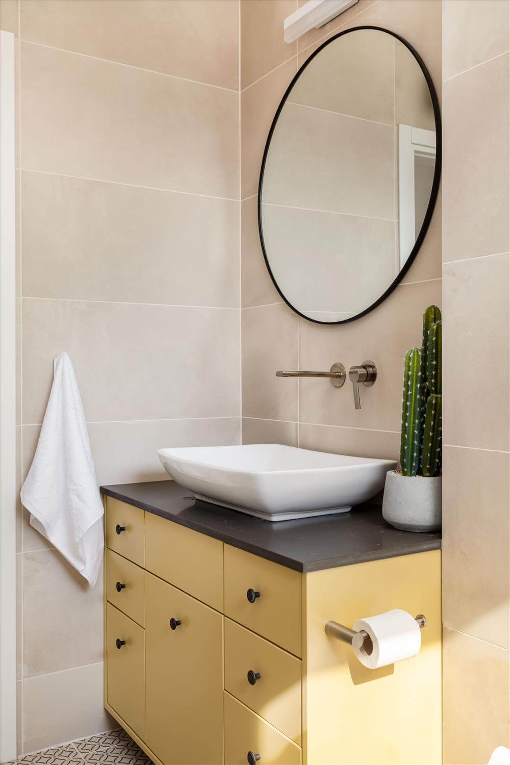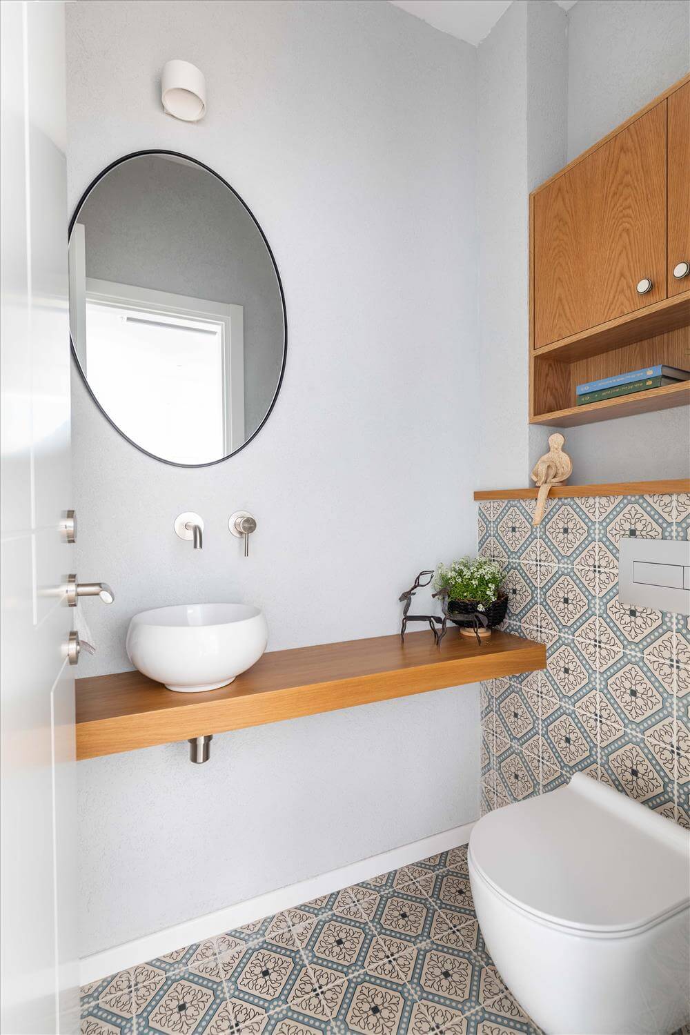 בפרקט, המעקה הוחלף והקיר הגבוה בחלל המדרגות נצבע בגוון תכלת ירקרק, צבע אהוב על בעלת הבית. שרותי האורחים רוצפו באריח מצויר בגוונים של אפור ותכלת, הכיור הקטן מונח בגאון על מדף עץ אלון. קיר גב מושב האסלה נוצל לארון שרות.