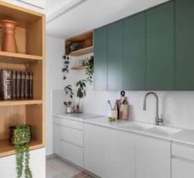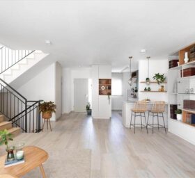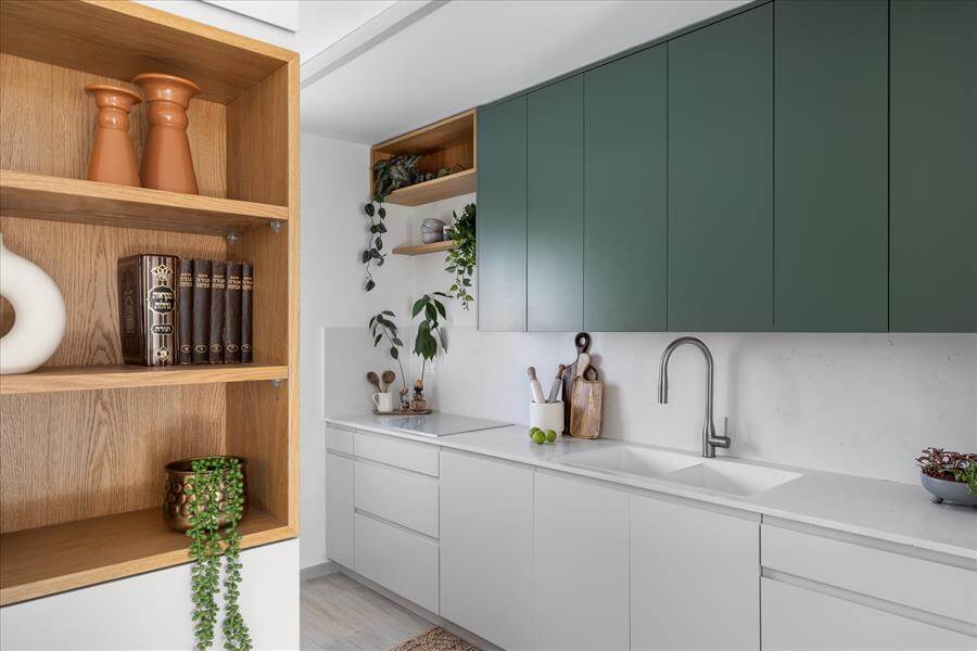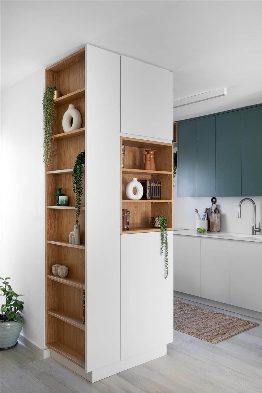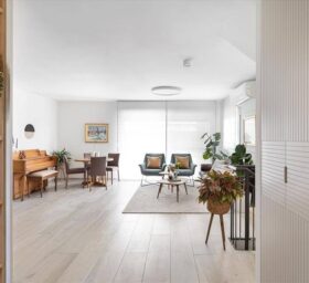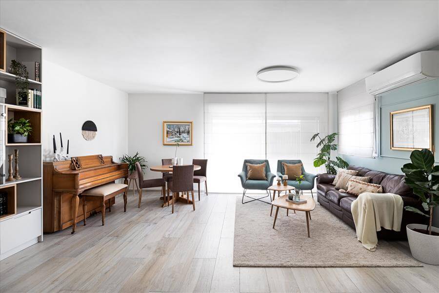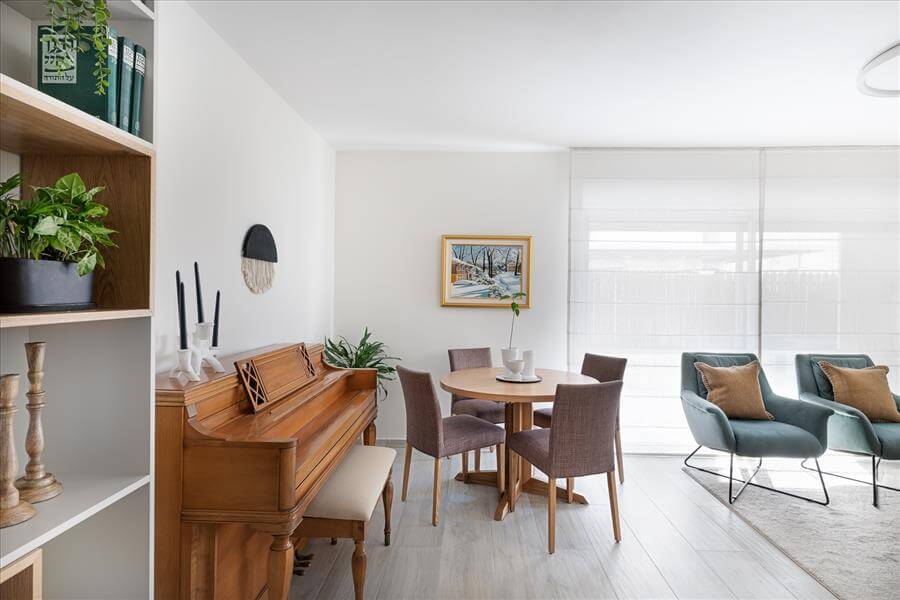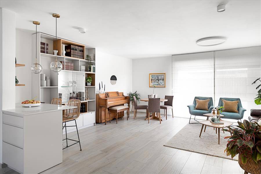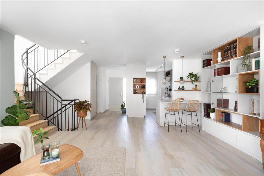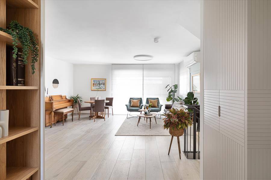 נקראתי לסייע לה לתכנן את הבית הדו מפלסי מחדש ובהתאם לצרכיה. הדרישה לבית מואר יצר פתיחת קיר חוצץ בין המטבח לפינת האוכל ובמקביל ע"מ לקבל מטבח גדול יותר הושלם קיר הכניסה עם יחידת נגרות פינתית שעוטפת את ארונות הבילדינג והמקרר במטבח במדפי עץ אלון שמקבלים את פני הנכנסים לבית. הסלון גם הוא עבר מהפך וקיר הטלויזיה פינה מקום לספריה מודרנית ומקום לפסנתר עץ עתיק שעשה עליה ארצה מאירופה.