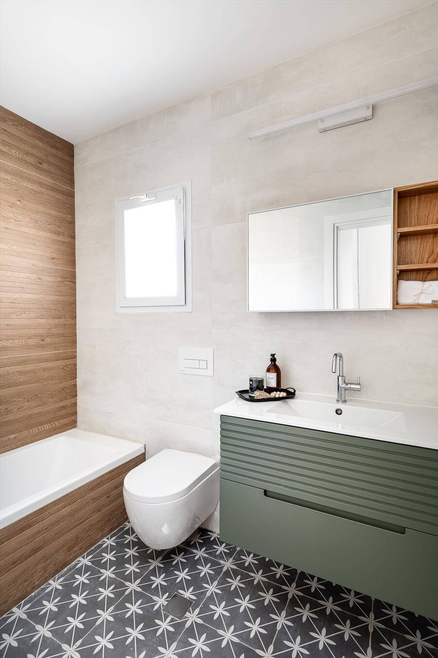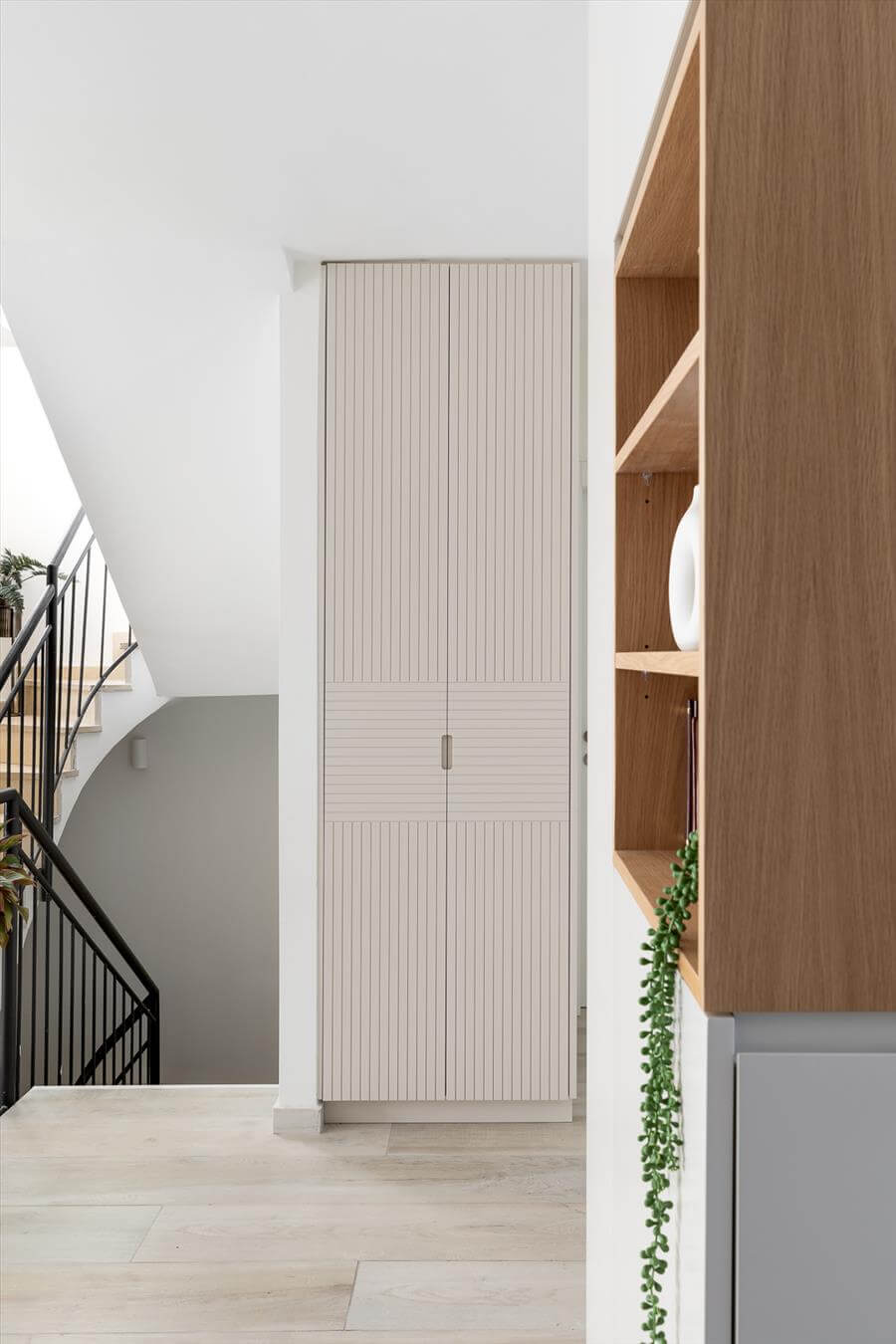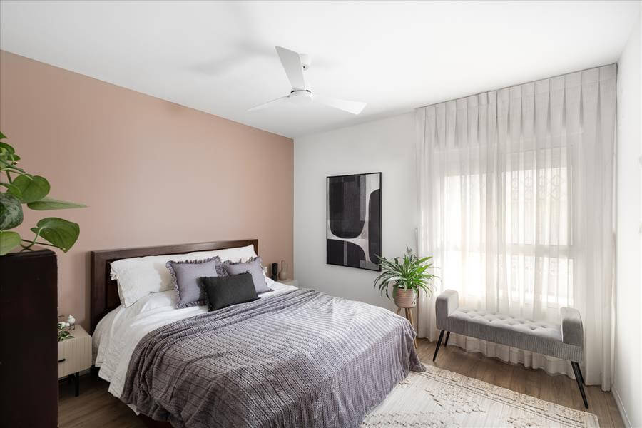 כך נוצרה יחידת דיור בקומת הכניסה. בקומה העליונה מצויים 3 חדרי שינה נוספים ושני חדרי אמבטיה צמודים שעברו שיפוץ מאסיבי. עוד במסדרון הקומה השניה היה ממוקם חדר שירות קטן ובו מכונת הכביסה. מאחר והלקוחה ביקשה חלל אינטימי לעבודה הוחלט לוותר על החדרון ולהעביר את מכונת הכביסה לגינה ובכך לנצל את השטח לצרכיה העסקיים. הקירות הורדו ובעזרת נגרות מותאמת ואישית נוצרה פינת עבודה מהונדסת ומדוייקת עבורה שכוללת ארון אחסון רחב. חדר המאסטר הוא יחידה בפני עצמה הכוללת חדר ארונות מפנק וחדר אמבטיה חלומי שמבטא ביתר דיוק את חלומה של הלקוחה לחלל רומנטי ונקי.