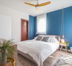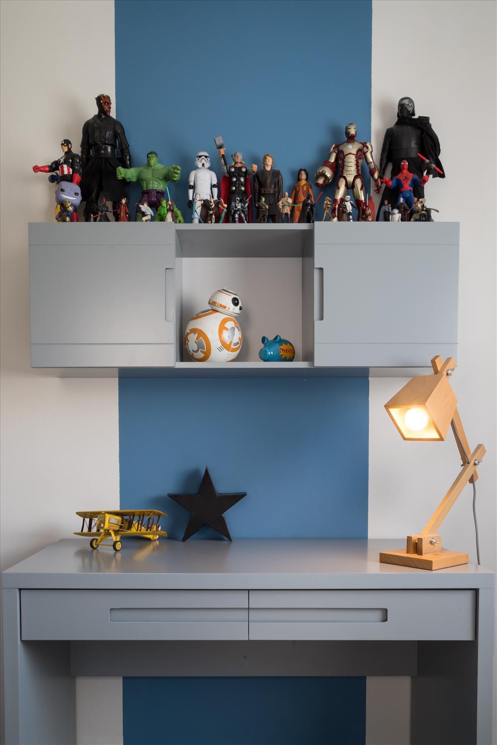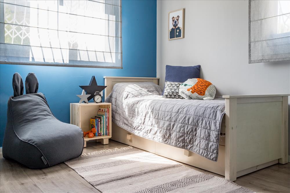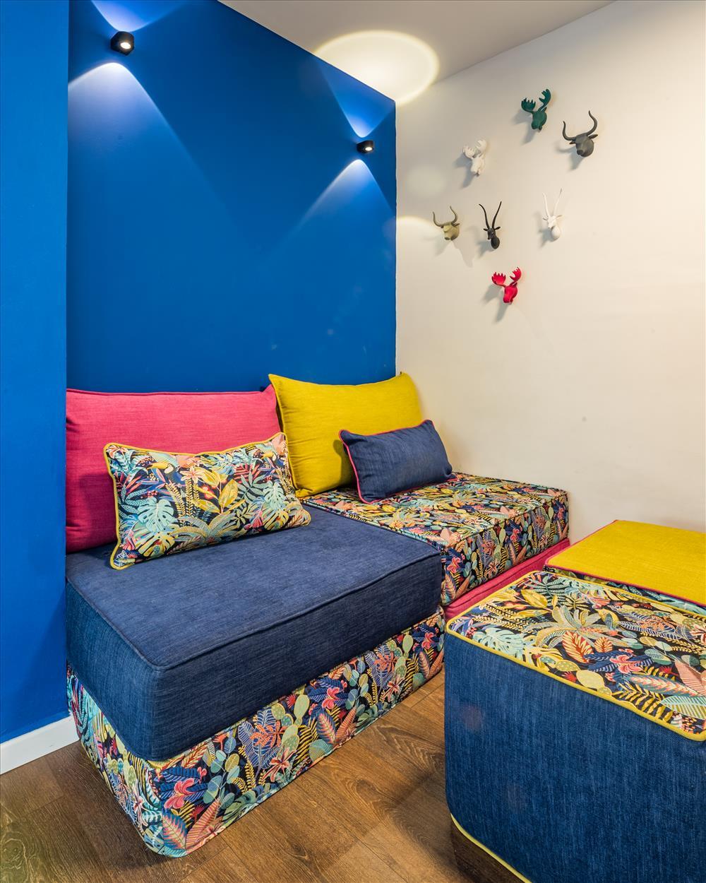 במיוחד ניכרים בחירות הצבעים העמוקים והחומרים ששולבו כאמירה ורצון להעצים את הסיפור שהבית מספר ולהראות את יחסי הגומלין וההדדיות בין החומר לצבע. מבין הצבעים השונים בולט במיוחד הצבע הכחול כמוטיב חוזר ליצירת אוירה של עומק, אחדות והרמוניה ומופיע בצבע הקלפה שבמטבח, בגוף התאורה שבשירותי האורחים , בארון האמבטיה שבחדר הרחצה, במעקה המדרגות שמסמן גבול בין שתי הקומות ובבחירת צבע הקיר בחדר השינה של ההורים.