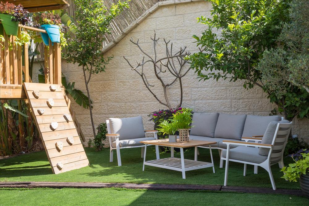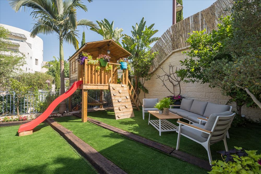לגינה נוספו פונקציות של אירוח ופינת קפה בנוסף לפונקציית האוכל שהיתה קיימת ובהתאמה לפנים הבית. כמו כן, נוספה דלת יציאה אחורית שמובילה לגינה החדשה והוגדר מקום משחק ושעשועים לילדים ובו בית עץ ומקום מרבץ.