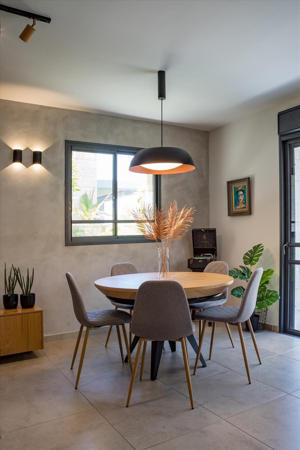 על מנת ליצור זרימה בחלל הציבורי נפתרה בעיית הצפיפות בין פינת האוכל והסלון לבין המטבח באמצעות פינת אוכל עגולה שיצרה המשכיות בין אריחי הפנים לחוץ כך שמי שנמצא בפנים הבית ירגיש חלק ממה שקורה בחוץ ולהפך.
