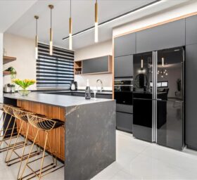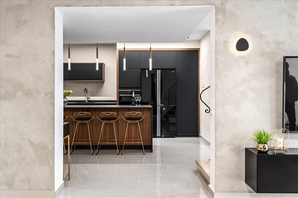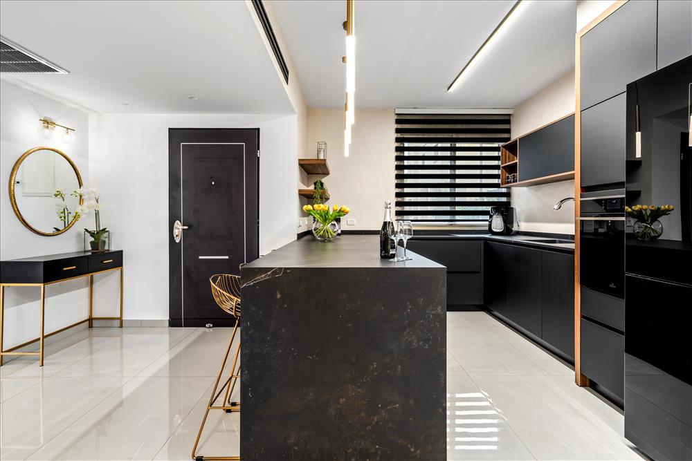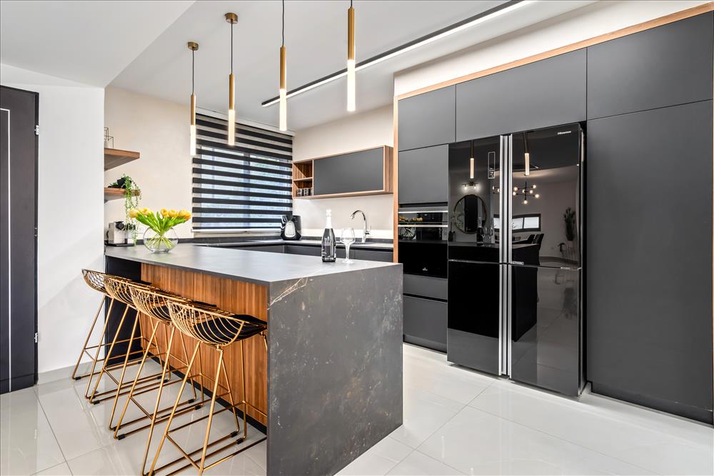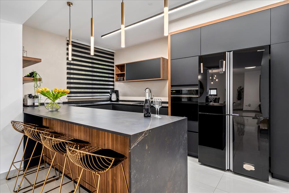 בעלת הבית חלמה על אי מרשים במטבח גדול ומרווח בצבעים כהים וחמימים וקיבלה!