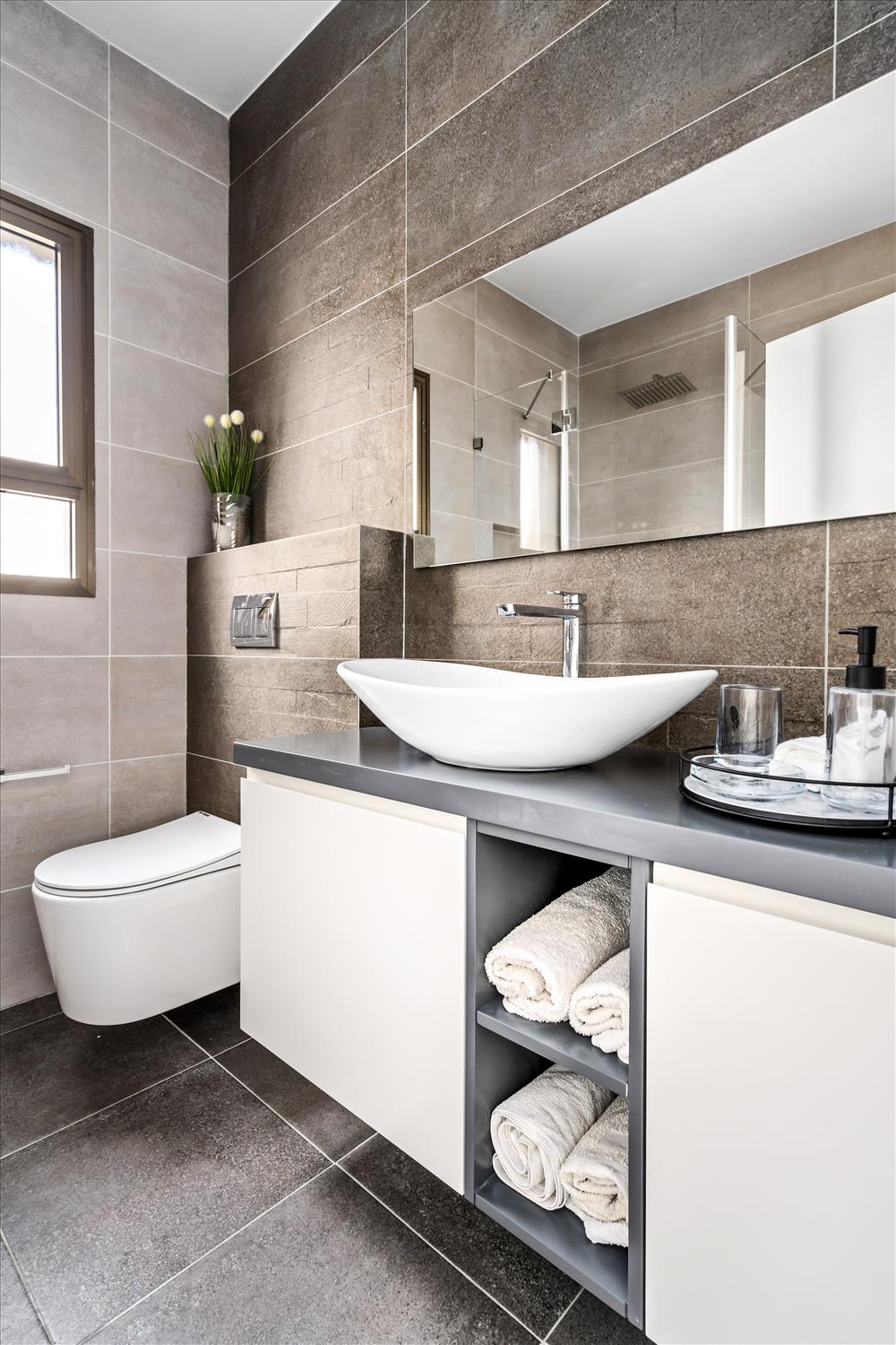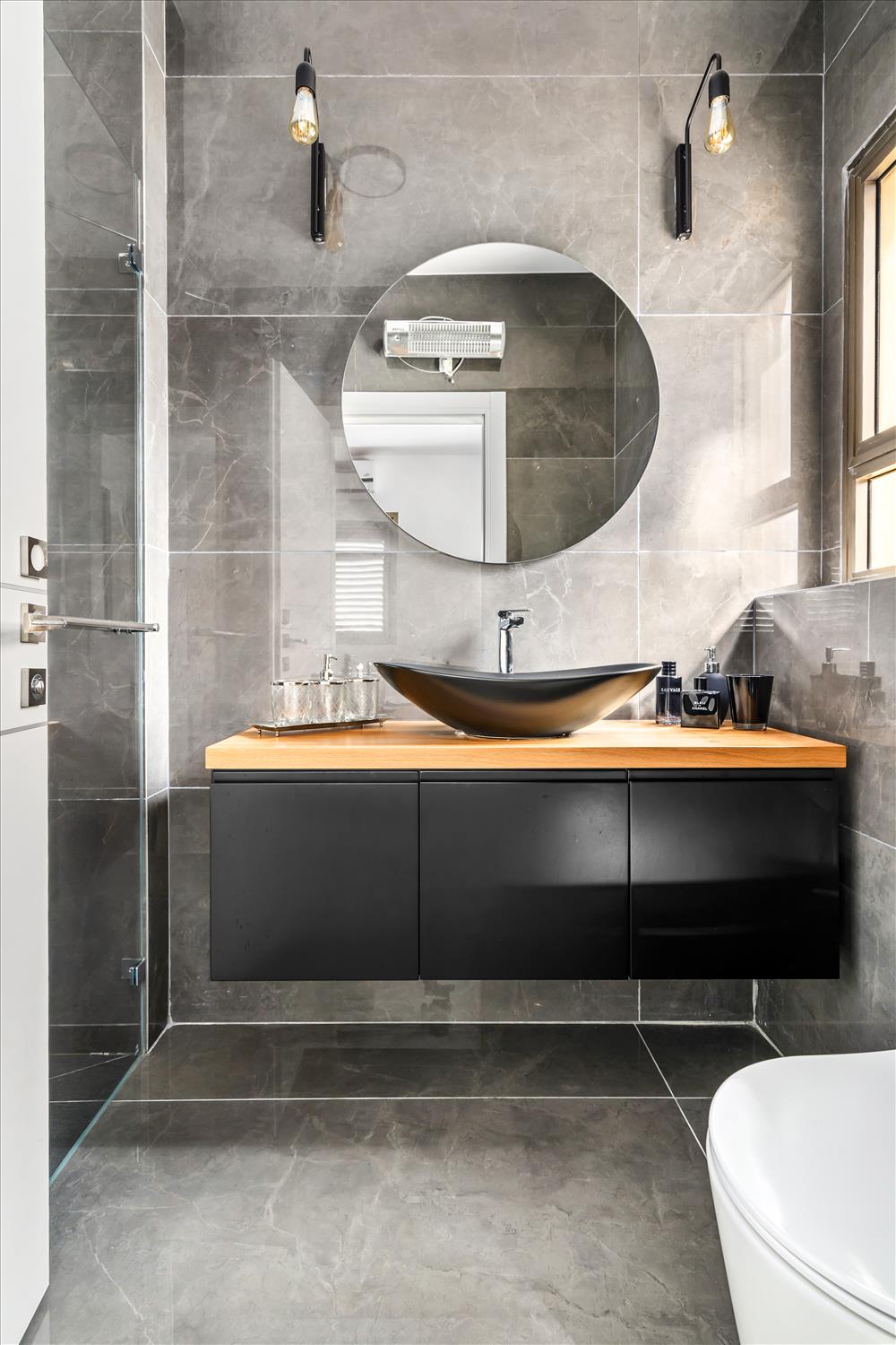 בעל הבית ביקש חדרי רחצה מרווחים ומפנקים וקיבל! שימו לב למגירת המגבות המגולגלות, אלמנט הלקוח מחדרי המלון המעוצבים ומעניק תמיד תחושה נעימה ויוקרתית.