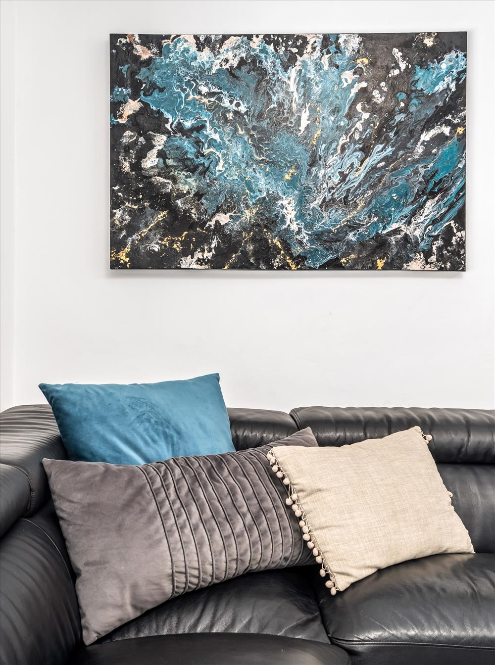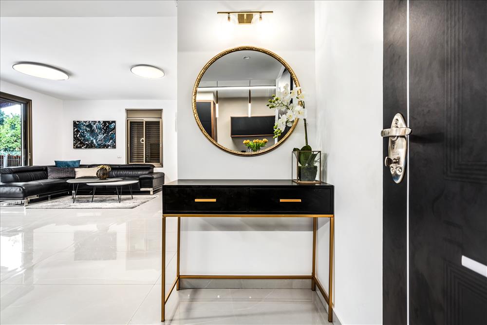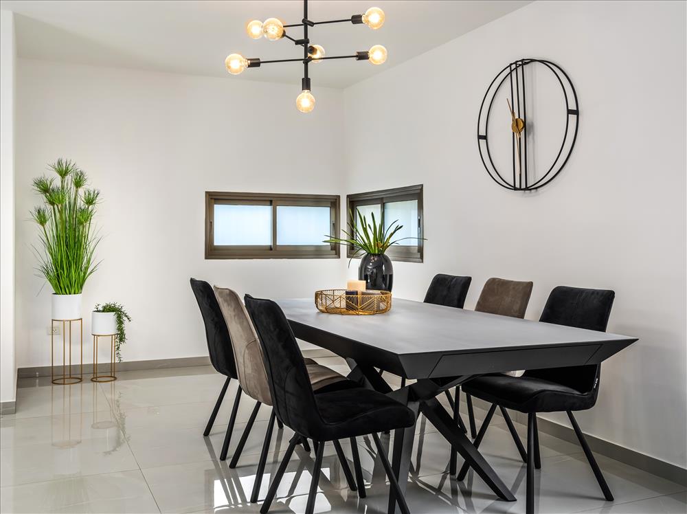הרצון לשמור על קו נקי ומודרני בא לידי ביטוי בבחירת החומרים, הצבעים והגוונים ששולבו בסלון ובפינת האוכל והנגרות שתוכננה בקפידה בחללי הבית השונים.