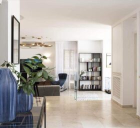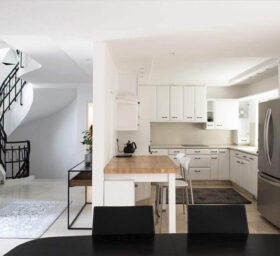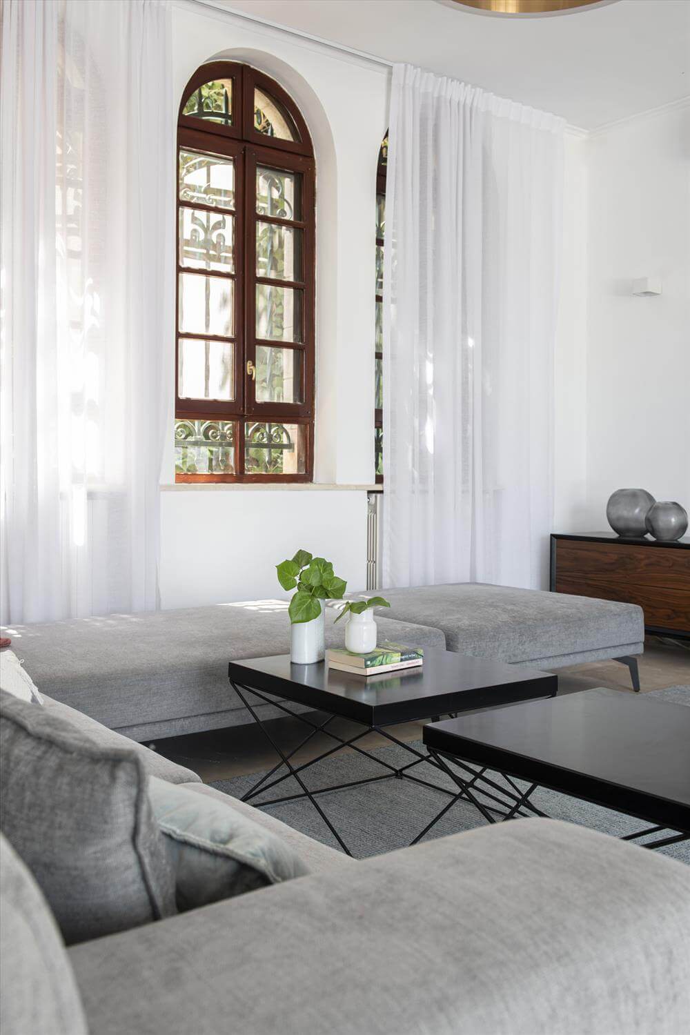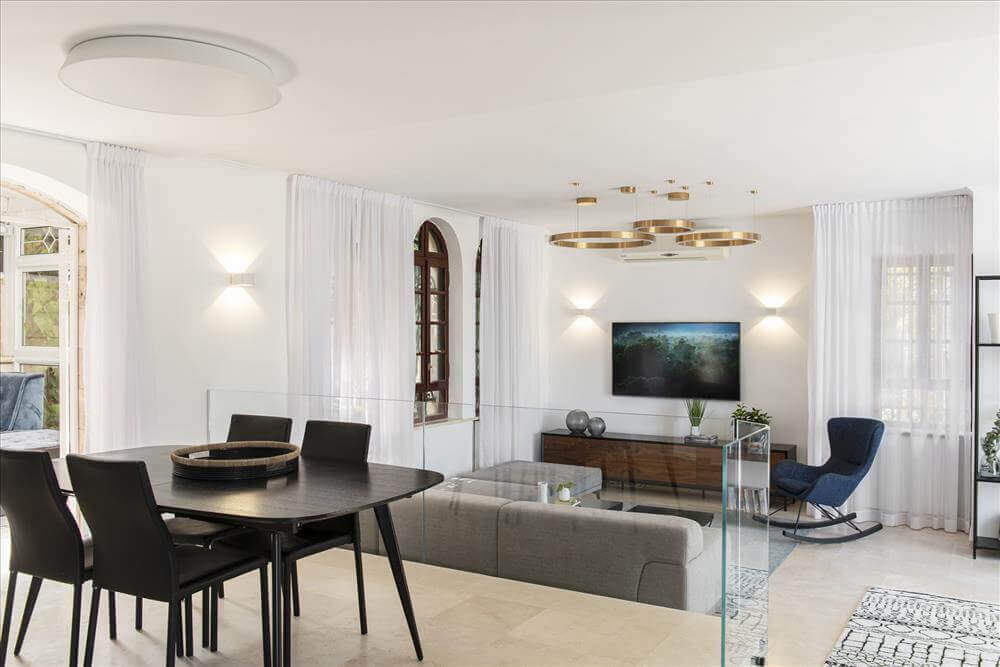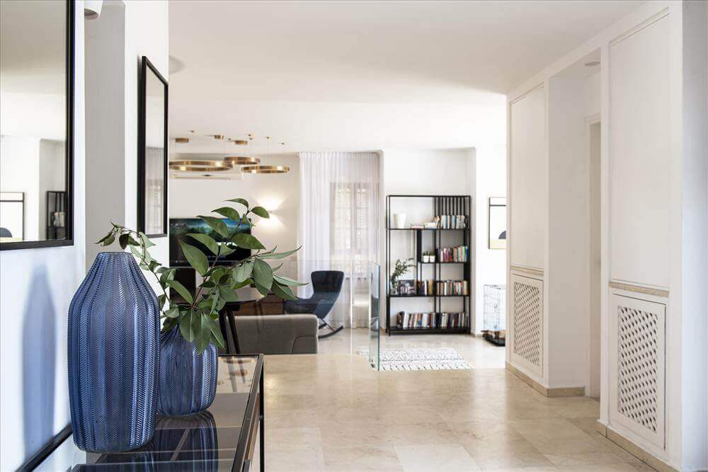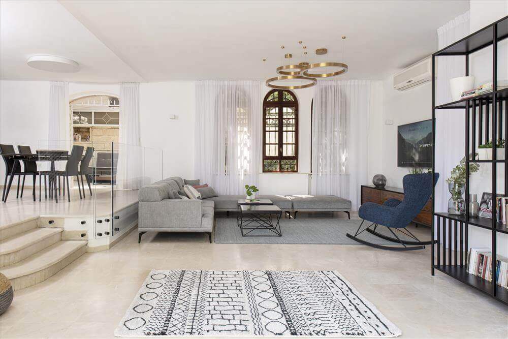בין מפלס הכניסה לסלון . לכל הבית נבחרו רהיטים, וילונות, תאורה ואקססוריז חדשים