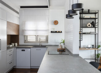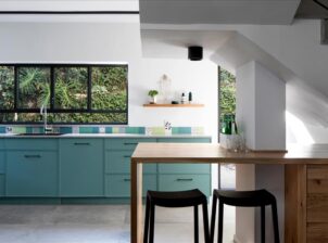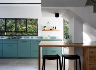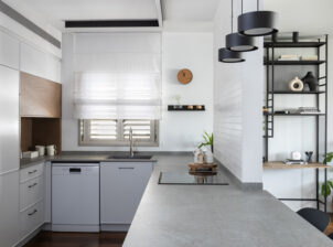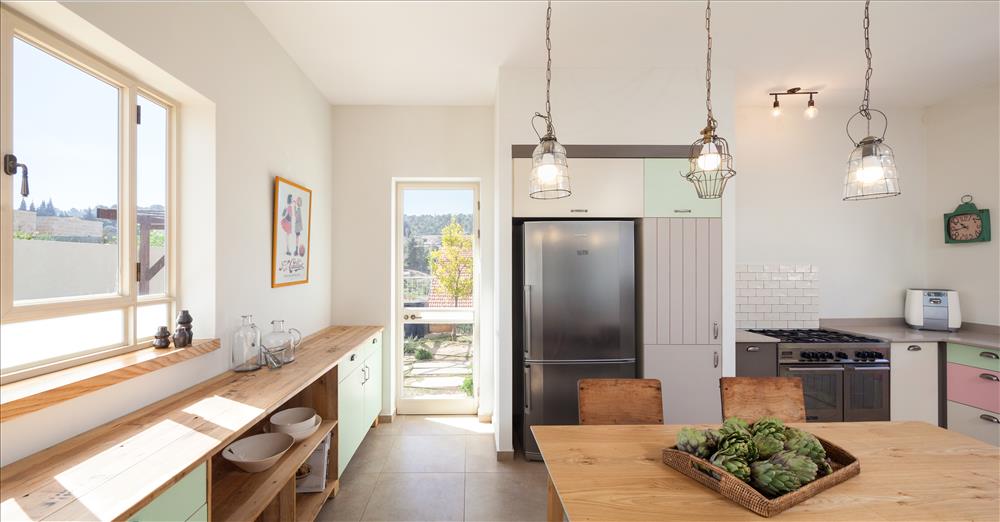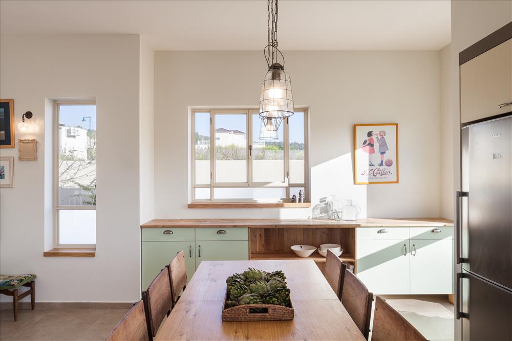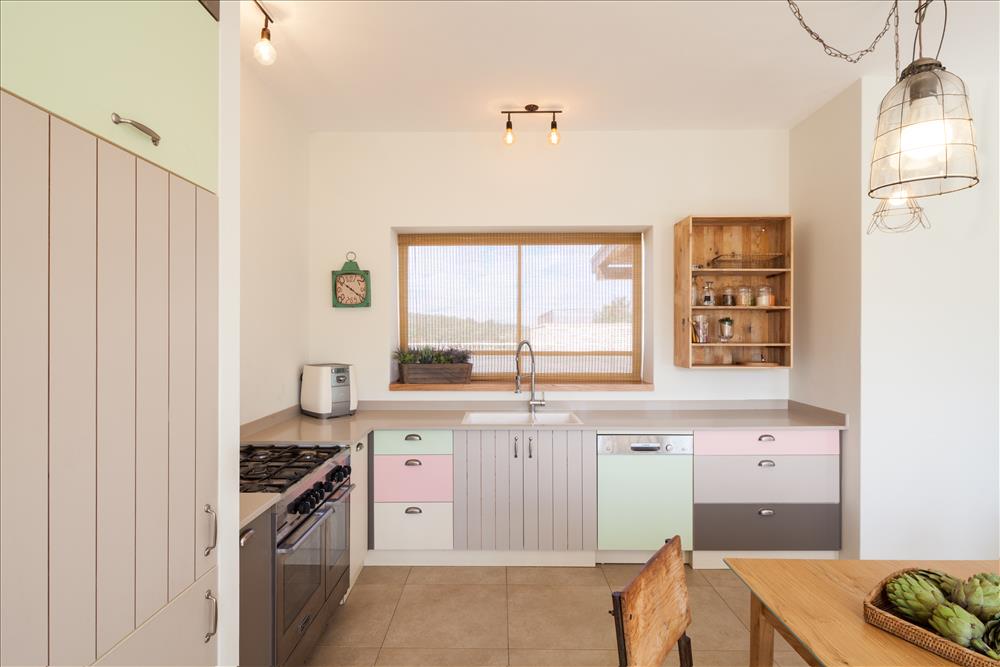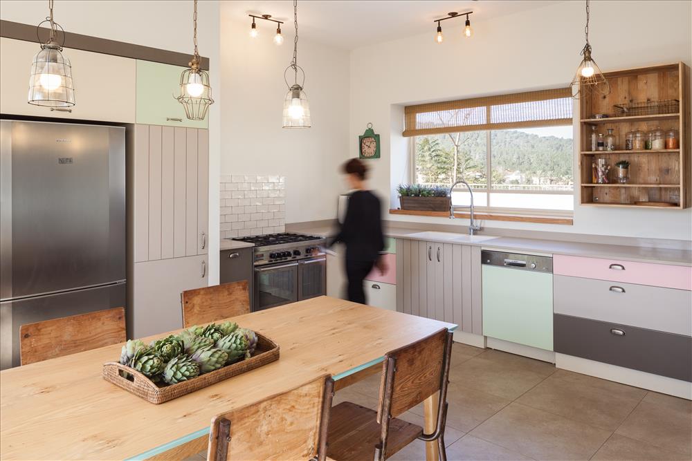 בחזיתות מטבח יושמה פלטת הצבעים שנבחרה לכל הבית, נלקחה החלטה לוותר על איילנד לטובת פינת אוכל מאווררת, ולהוסיף רהיט אחסון מעץ ממוחזר.