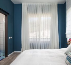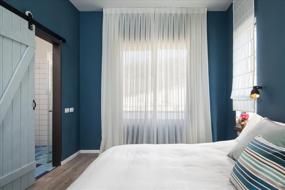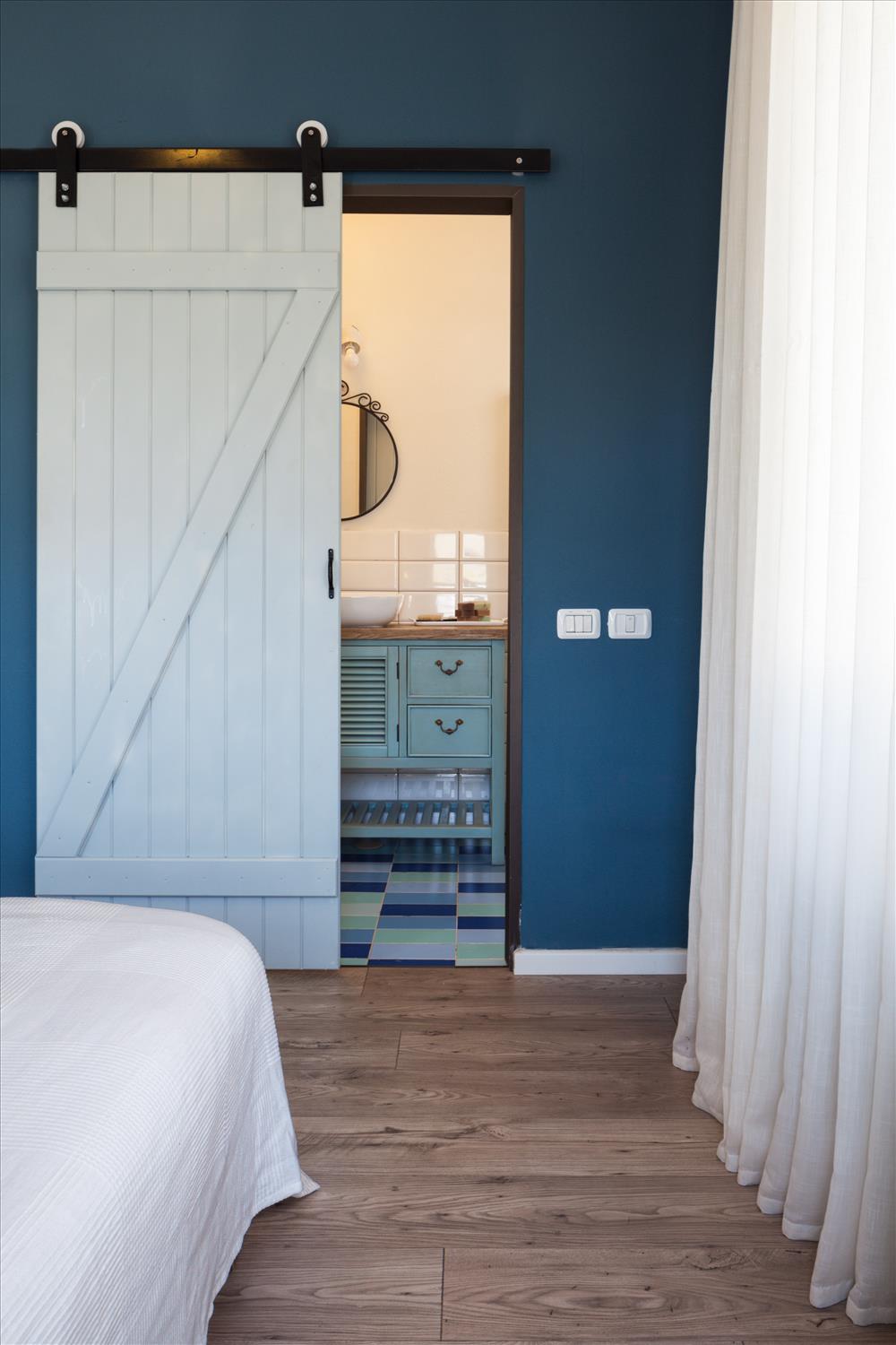 בחדר ההורים בחרנו גוון כחול עמוק לכל קירות החדר ויצרנו חלל אינטימי ומעוצב. את חדר הרחצה חותמת דלת אורווה שבעל הבית בנה.