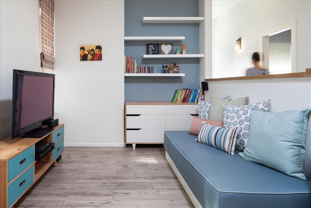 בפינת המשפחה נבחרה פינת רביצה בגוונים כחולים ווילונות תואמים שיוצרים אזור נעים לצפייה בטלויזיה ובילוי משפחתי שקט.