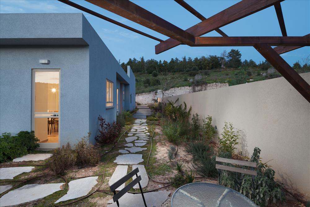 הנוף של החצר והרי ירושלים נשקף מחלונות הבית הממוסגרים באלומיניום בהיר.