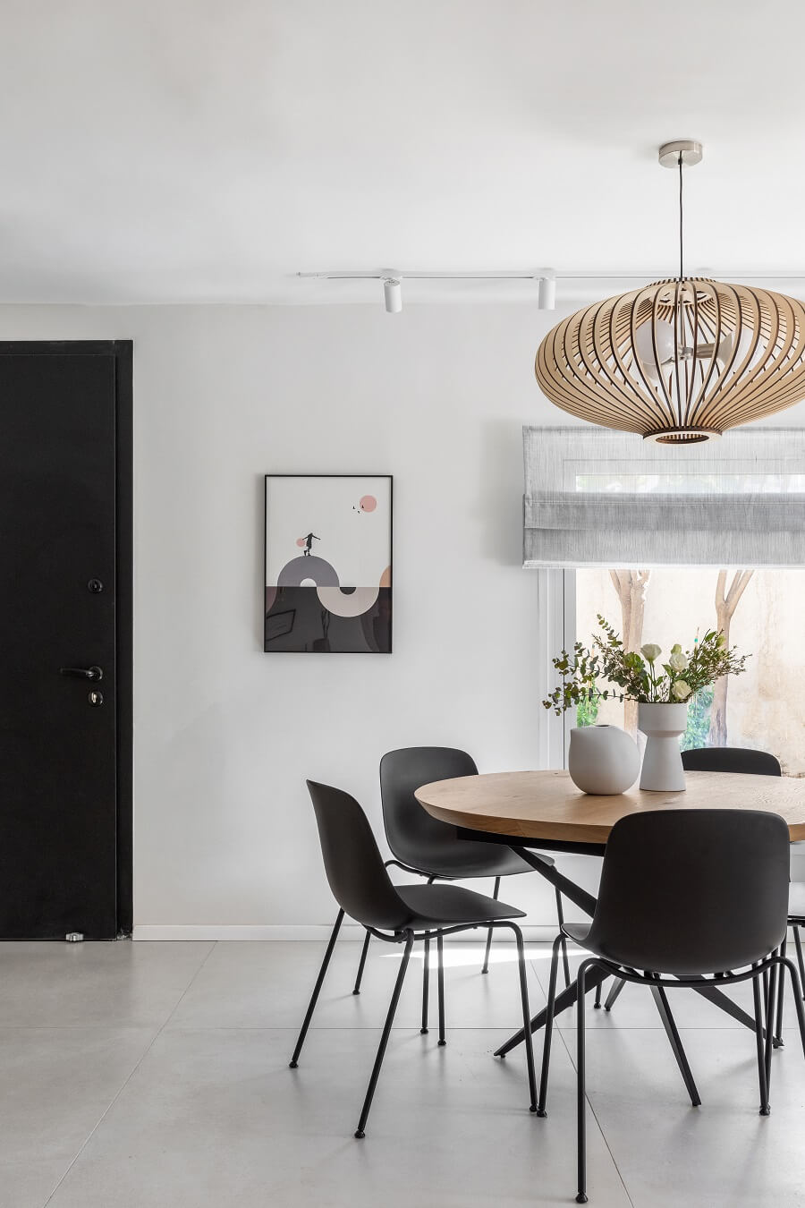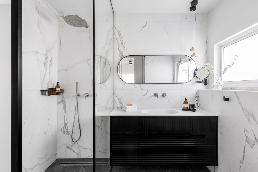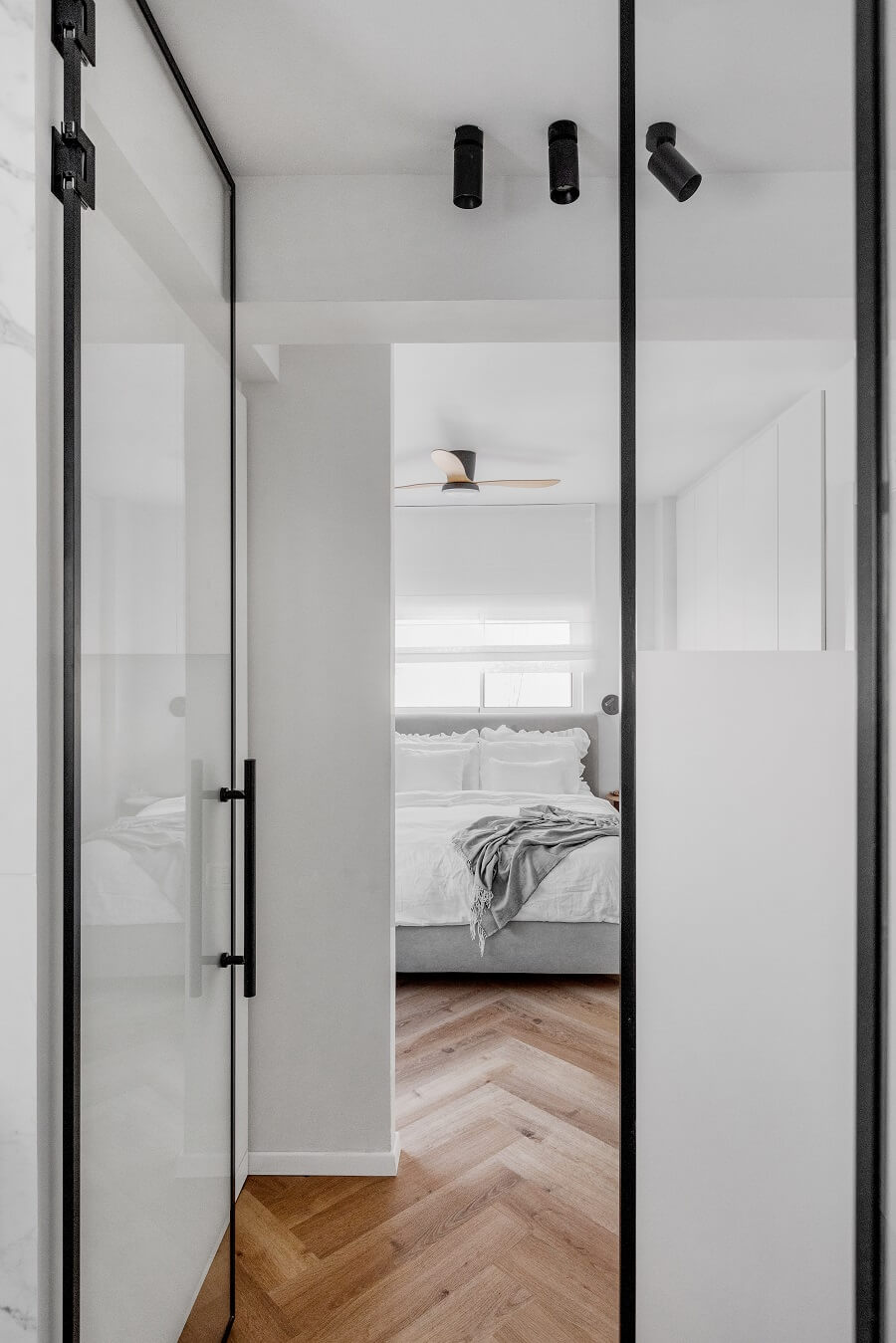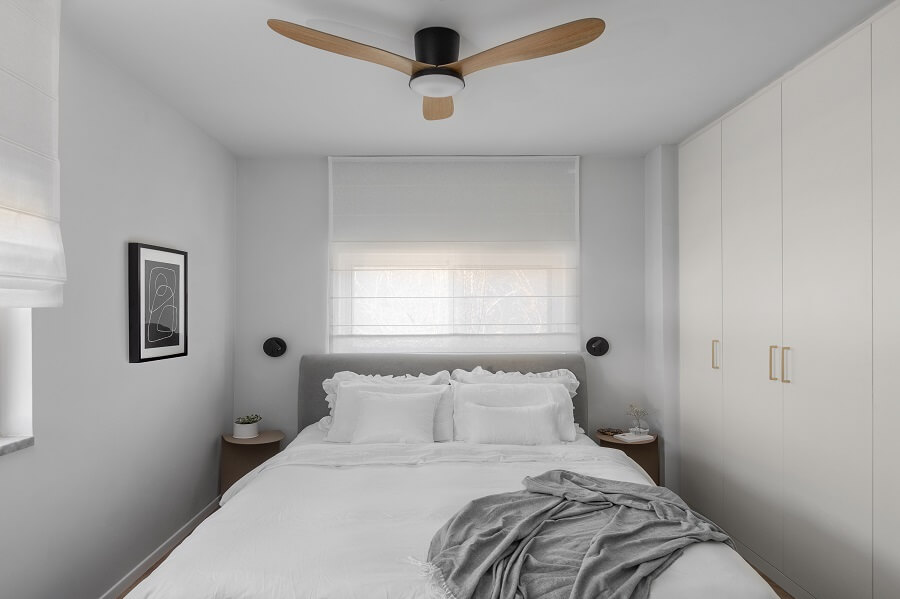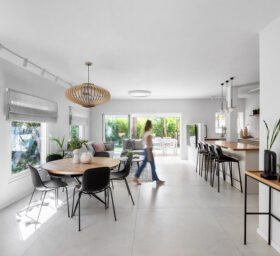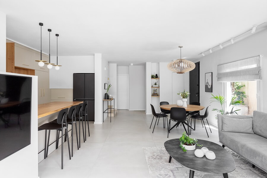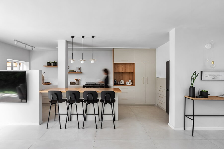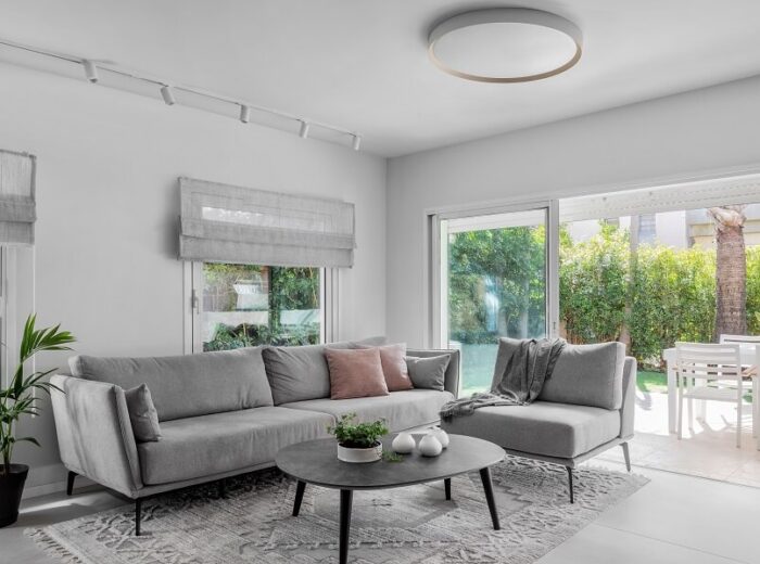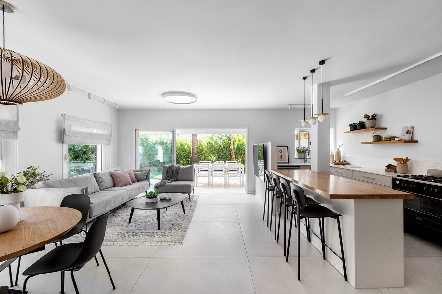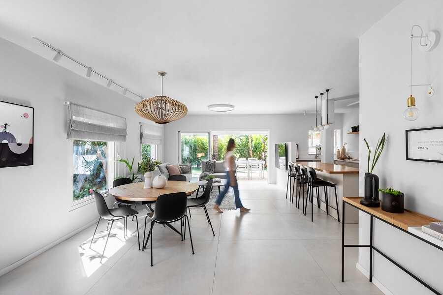 הורדנו את קירות המבואה, ביטלנו הנמכות תקרה של מיזוג מרכזי לטובת מיזוג עילי, הורדנו קיר חוצץ בין פינת האוכל והמטבח לטובת מטבח גדול ומרווח כולל דלפק ואחסון נוסף ואת פינת האוכל מיקמנו בצמוד לסלון. את שרותי האורחים הגדלנו מעט על חשבון חדר עבודה החלפנו את דלת הכניסה ואת כל הקומה ריצפנו באריחים גדולים ובהירים. בקומה העליונה הוספנו חלל בצמוד לחדר השינה של ההורים לטובת חדר רחצה מרווח עם מחיצת זכוכית שתורמת לתחושה בוטיקית. את חלל חדר הרחצה הישן סיפחנו בחלקו לחדר רחצה ילדים חדש ובחלקו לנישת ארון בגדים בחדר הורים. לקומה העליונה הוספנו פרקט והוחלפו דלתות הפנים.