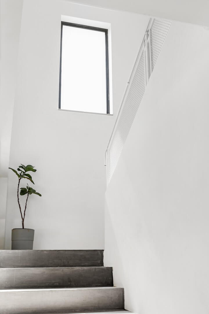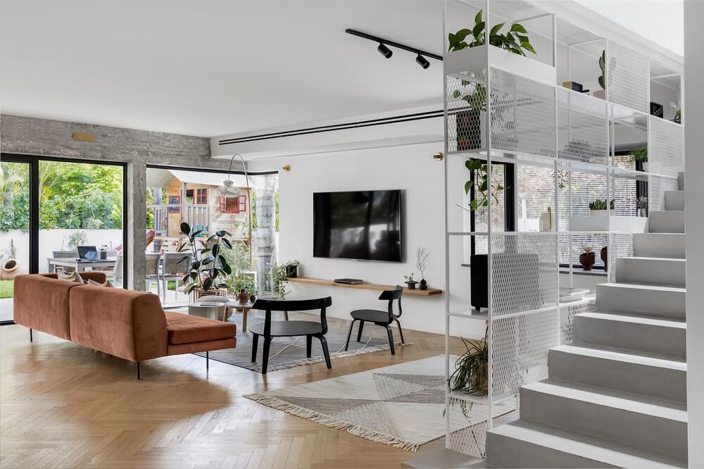 בסלון הוחלף המעקה המיושן בספריית ברזל לבנה גדולה הפתוחה לשני הכיוונים. הקיר החיצוני לכיוון החצר הוסר כמעט במלואו, והוחלף בוויטרינה ענקית. הוחלט להשאיר את הבטון חשוף, על מנת להכניס חומר נוסף ועניין לעיצוב הבית. במרכז החלל הוצבה ספה מעוצבת, ולצידה שתי