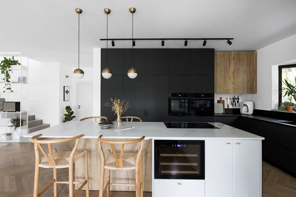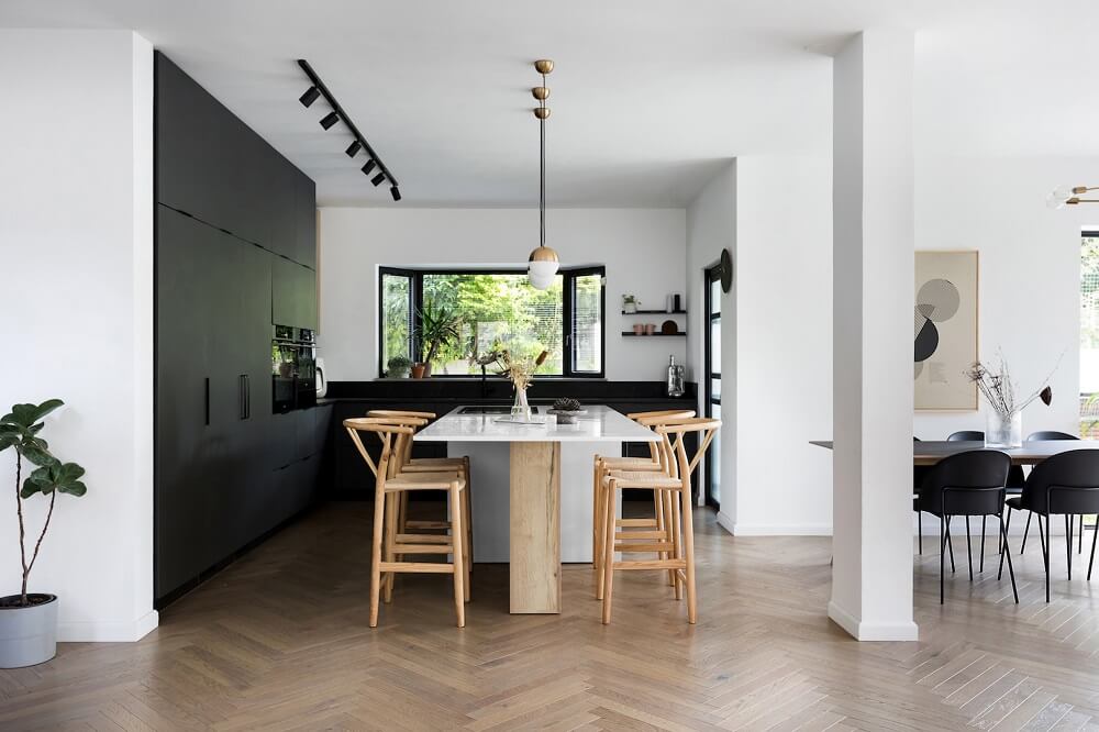 המטבח עוצב בצורה של רי"ש: דופן אחת של הארונות הגבוהים, עם מקרר אינטגרלי, ודופן שנייה נמוכה, המשמשת למשטח עבודה גדול, כיור – וחלון שצופה החוצה ומכניס ירוק פנימה. במרכז המטבח הוצב אי רחב המאפשר עבודה עליו, ומשמש גם כפינת אוכל יומיומית.