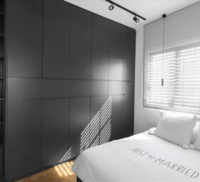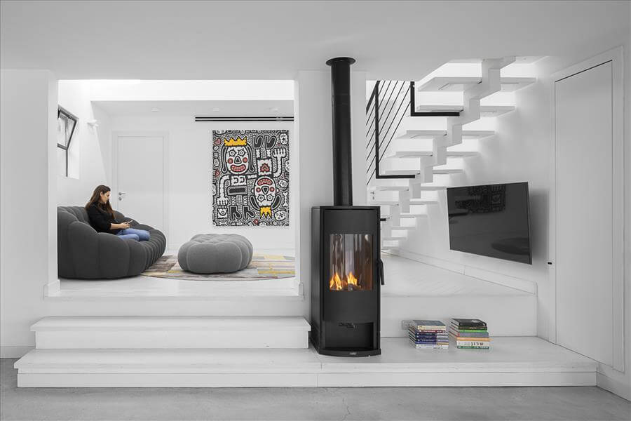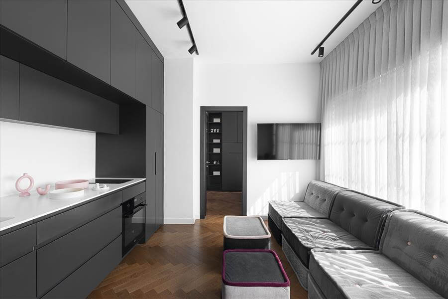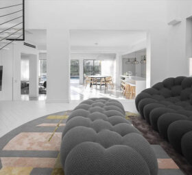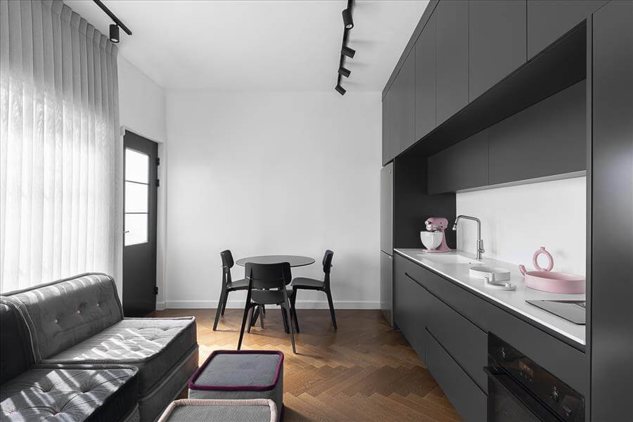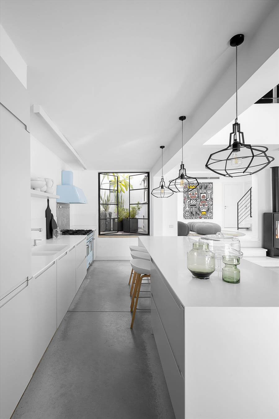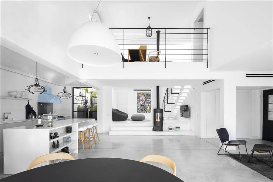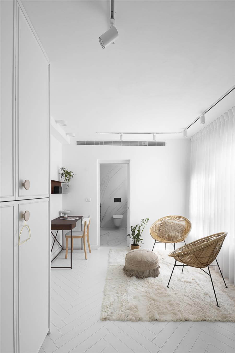 הקו הנקי והמינימליסטי של השיפוץ הראשון נשמר גם הפעם, תוך מיקסום אזורי האחסון, והלבשה מאסיבית של כל חללי הבית.