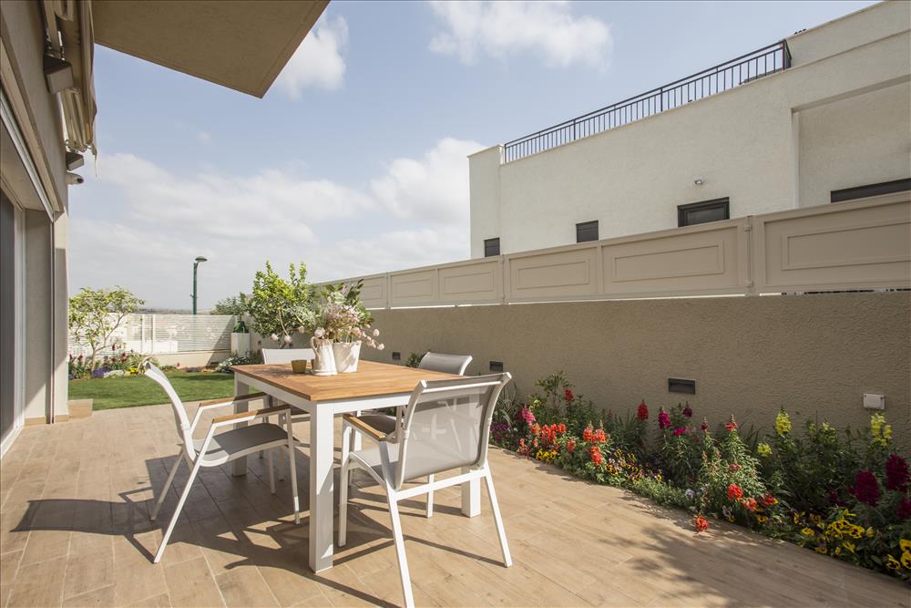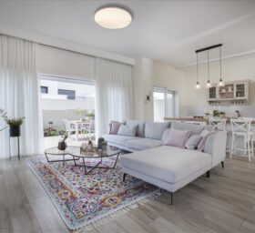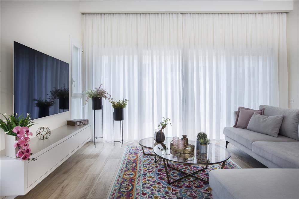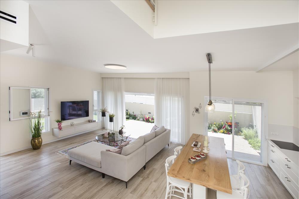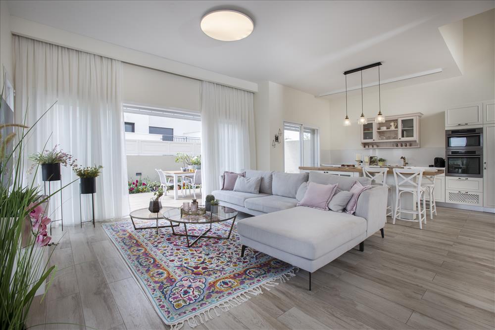 לסלון נבחרה ספה בצבע בהיר ועליה הונחו כריות, נתלו וילונות בהירים מבדים רכים ונשפכים והקומה רוצפה בגרניט פורצלן דמוי פרקט שנותן מראה כפרי וחמים ומתחבר לגווני הגינה, שתוכננה להשתלב ולהיות חלק מהבית.