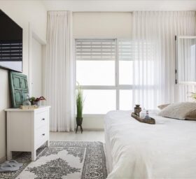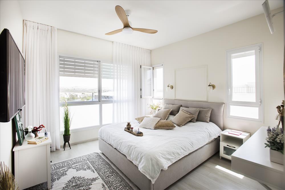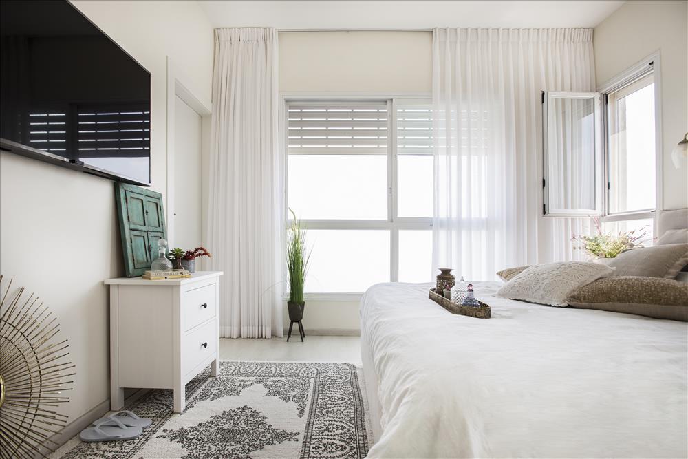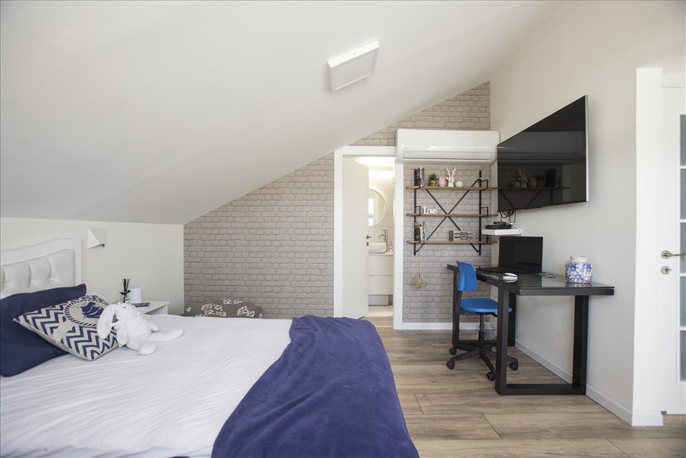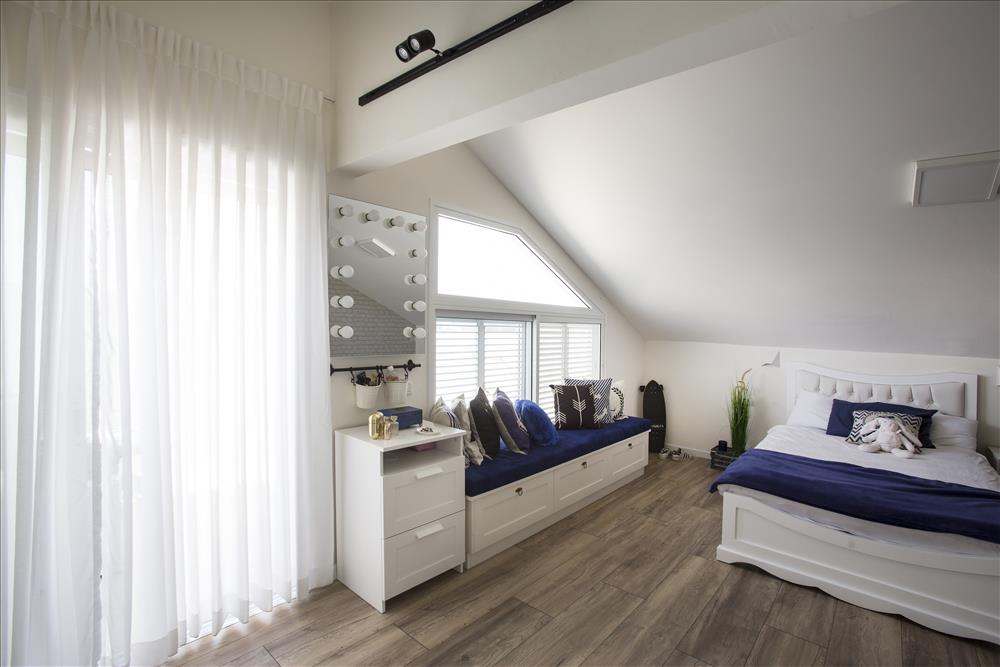 חדר בנגיעות של לבן ועץ שנותן חמימות בשילוב של צבע רויאל. בחדר ספסל שהוזמן מנגר פרטי ועליו כריות ישיבה מרופדות אף הן בצבע רויאל.