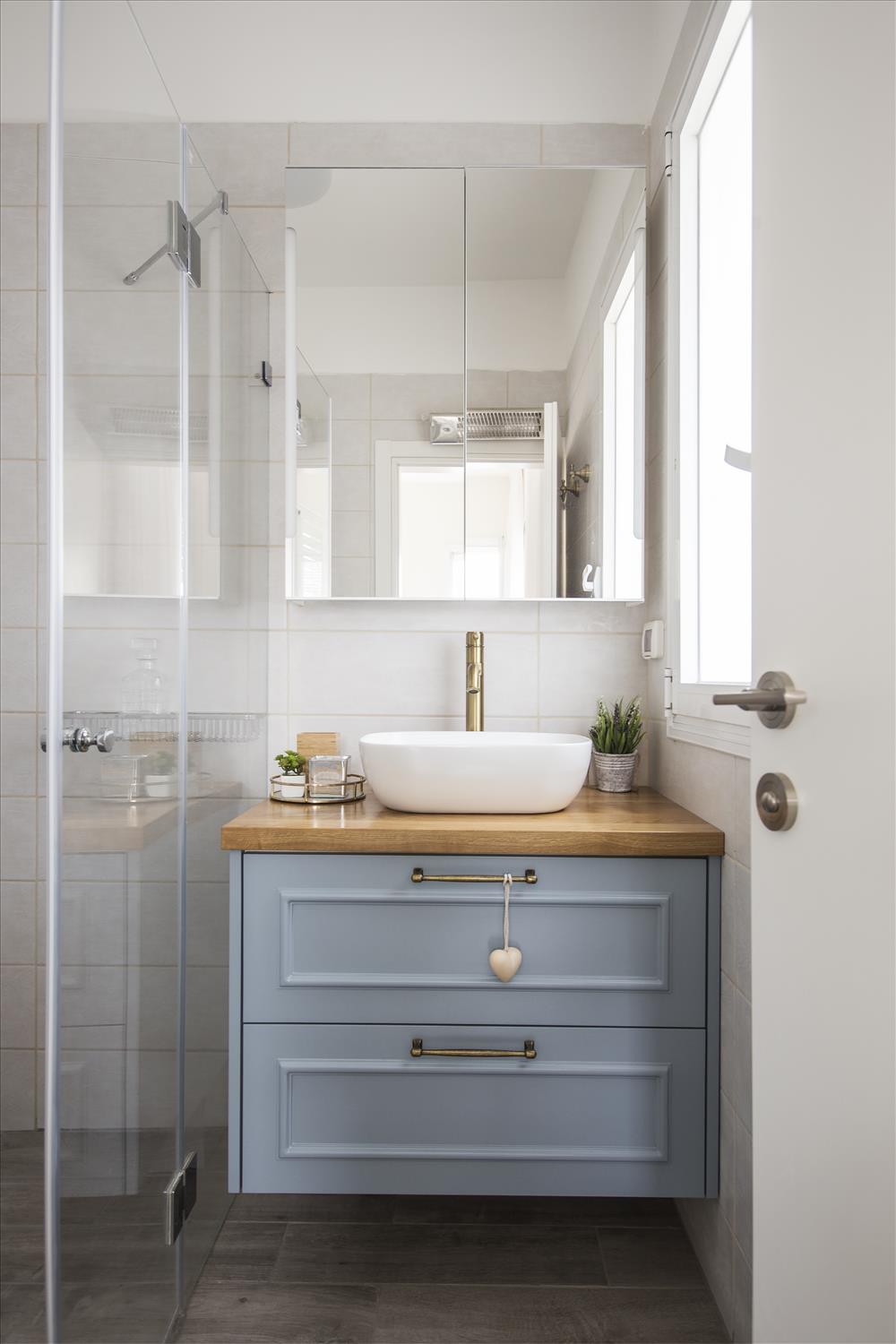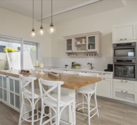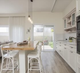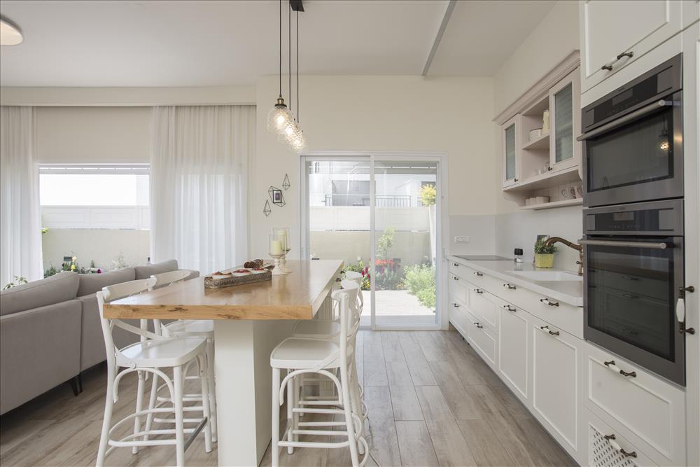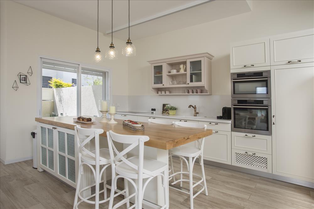 קומת הכניסה עוצבה בצבעים בהירים עם נגיעות של גוון פודרה, נבחר מטבח בסגנון כפרי בצבע לבן שבור ובו משולבים אלמנטים כפריים כמו משטח העץ שמונח על האי.