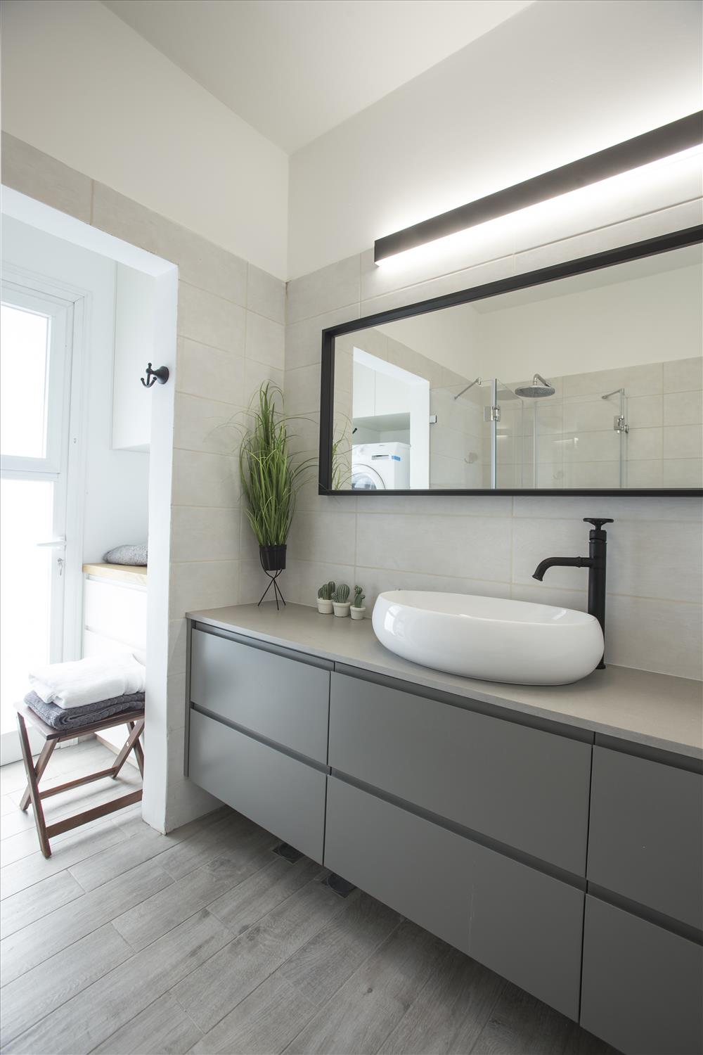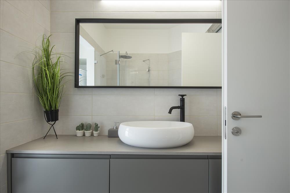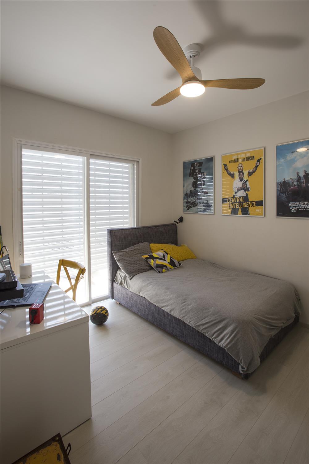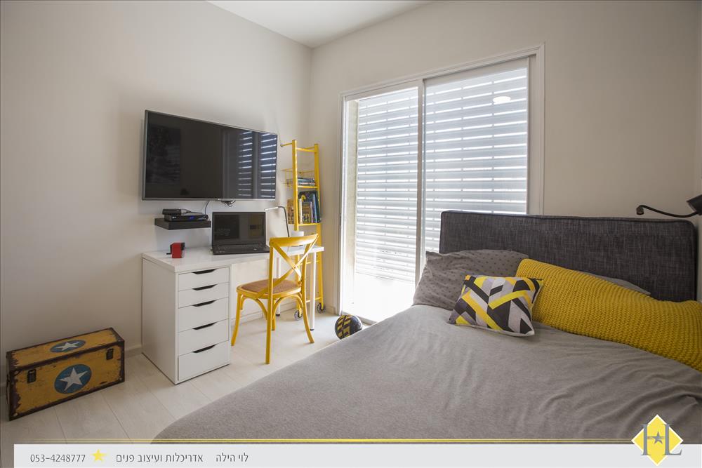 חדרו של הבן נבחרו גווני אפור כהה ושחור ושולבו נגיעות צהובות. חדר האמבטיה שנמצא סמוך עוצב בצבעים תואמים ובעיצוב צעיר ומודרני.