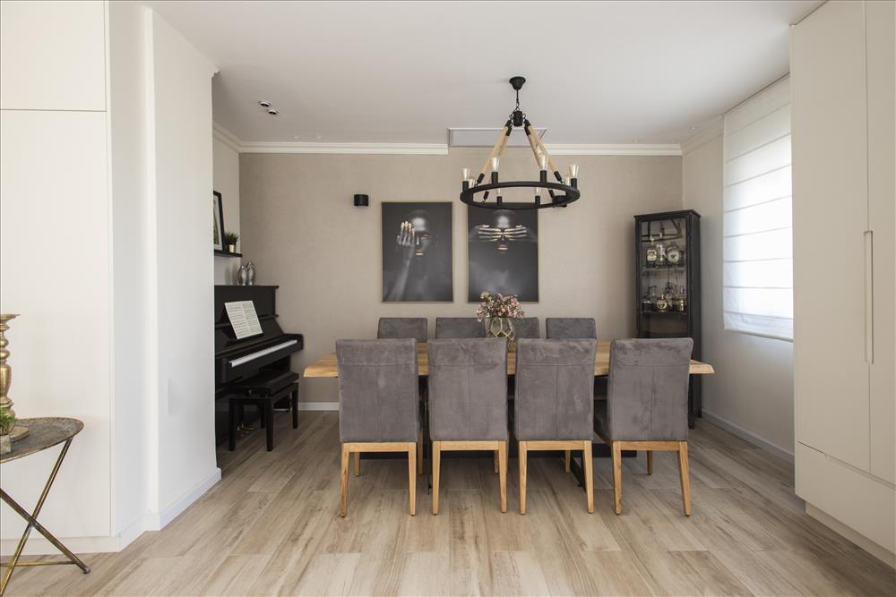 כנון הבית החל מהפסנתר שמוקם בנישה של פינת האוכל. להשלמת הקו העיצובי של הפסנתר נבחר שולחן אבירים כפינת האוכל ונתלו בו שתי תמונות בצבעים תואמים.